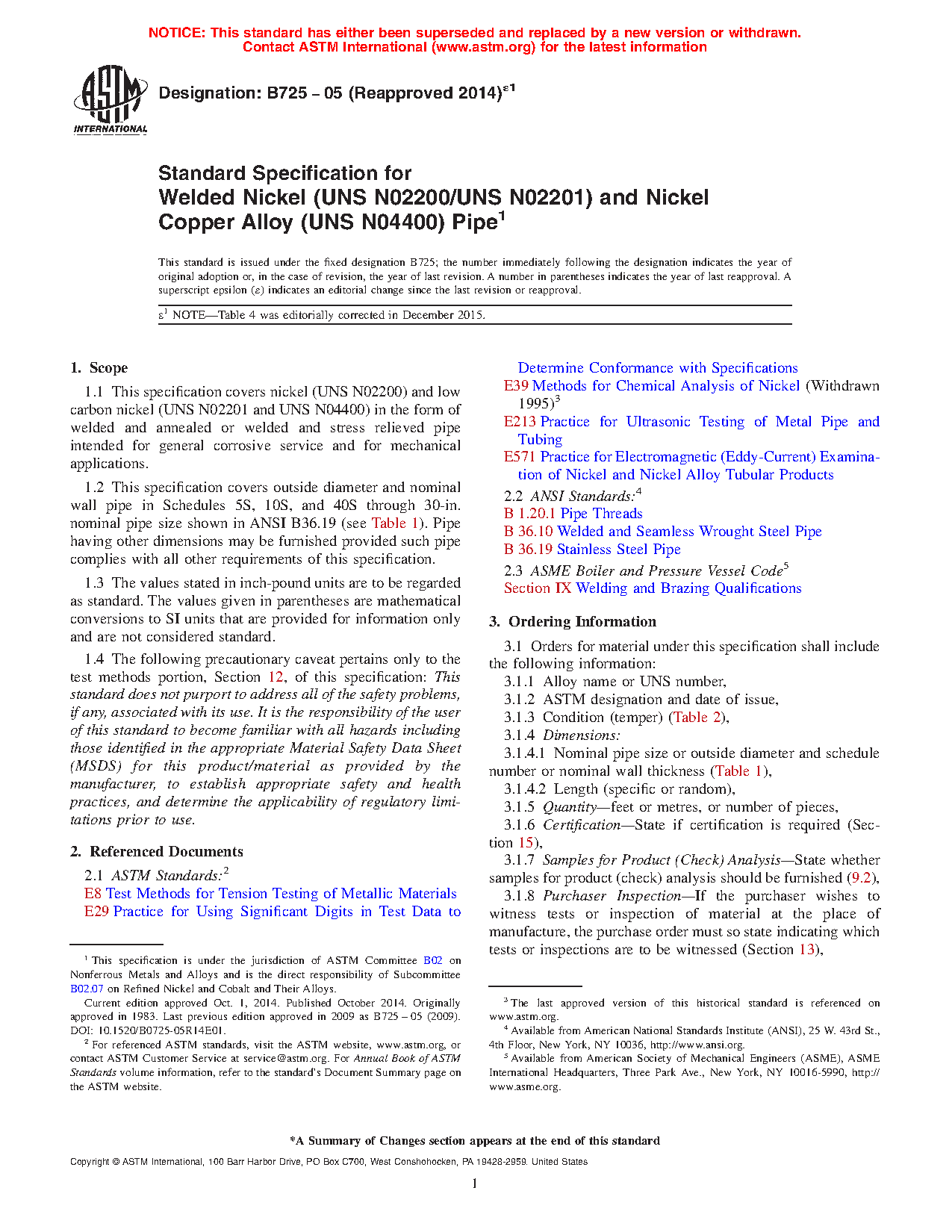 1.1 This specification covers nickel (UNS N02200), low carbon nickel (UNS N02201) and nickel copper alloy (UNS N04400) in the form of welded and annealed or welded and stress relieved pipe intended for general corrosive service and for mechanical applications.