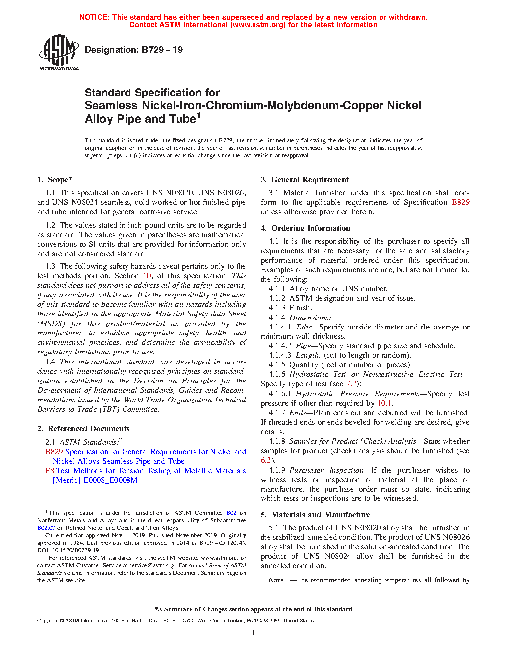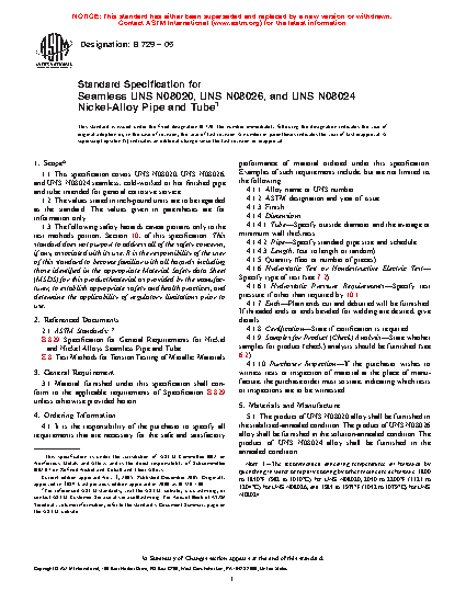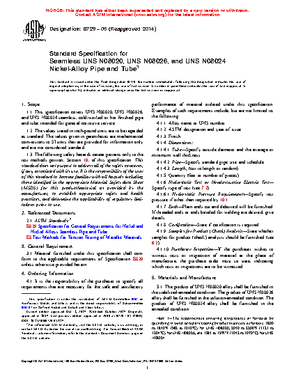 1.1 This specification covers UNS N08020, UNS N08026, and UNS N08024 seamless, cold-worked or hot finished pipe and tube intended for general corrosive service.