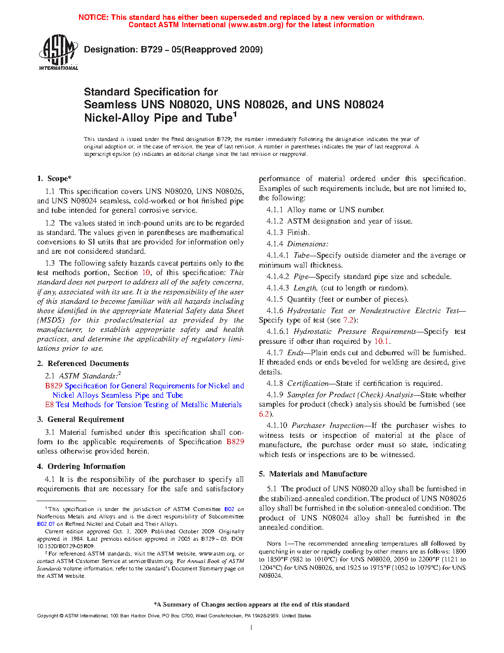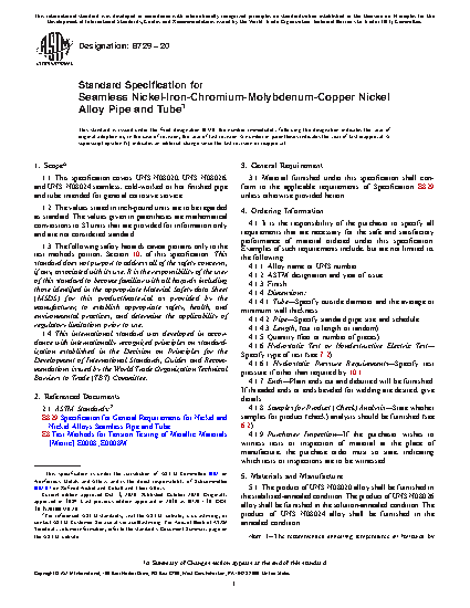 This specification covers UNS N08020, UNS N08026 and UNS N08024 nickel-alloy seamless, cold-worked or hot-finished pipe and tube intended for general corrosive service. The product of UNS N08020 alloy, UNS N08026 alloy, and UNS N08024 alloy shall be furnished in the stabilized-annealed condition, solution-annealed condition, and annealed condition, respectively. The tensile strength, yield strength, and elongation requirements are specified. Hydrostatic and nondestructive electric tests shall be conducted on the each pipe or tube.
