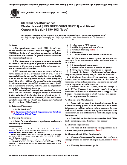 1.1 This specification covers nickel (UNS N02200), low-carbon nickel (UNS N02201), and nickel copper alloy (UNS N04400) in the form of welded and annealed or welded and stress-relieved tube intended for general corrosive service and for mechanical applications.