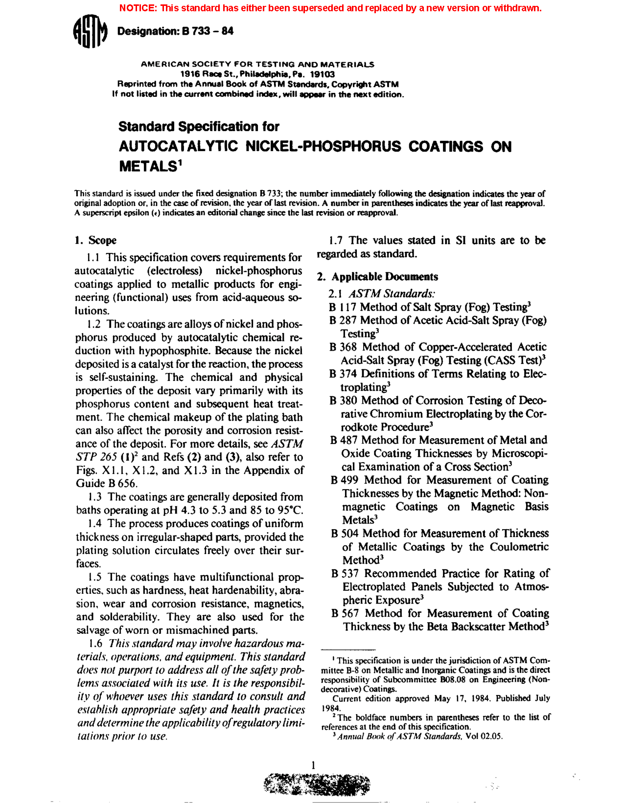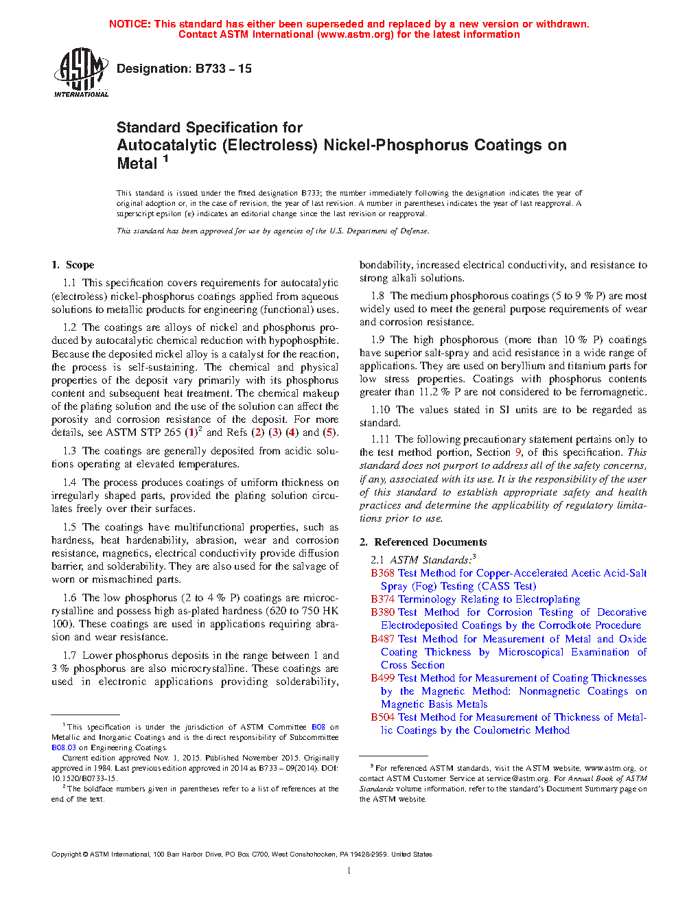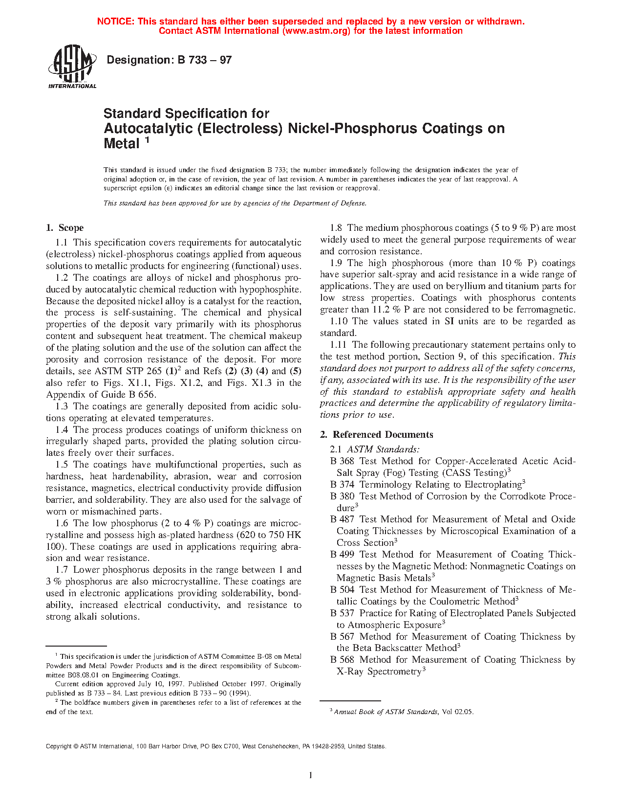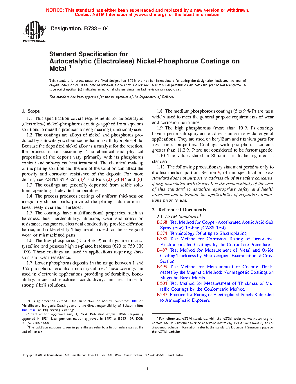 1.2 The coatings are alloys of nickel and phosphorus produced by autocatalytic chemical reduction with hypophosphite. Because the deposited nickel alloy is a catalyst for the reaction, the process is self-sustaining. The chemical and physical properties of the deposit vary primarily with its phosphorus content and subsequent heat treatment. The chemical makeup of the plating solution and the use of the solution can affect the porosity and corrosion resistance of the deposit. For more details, see ASTM STP 265 (1)2 and Refs (2), (3), (4), and (5).