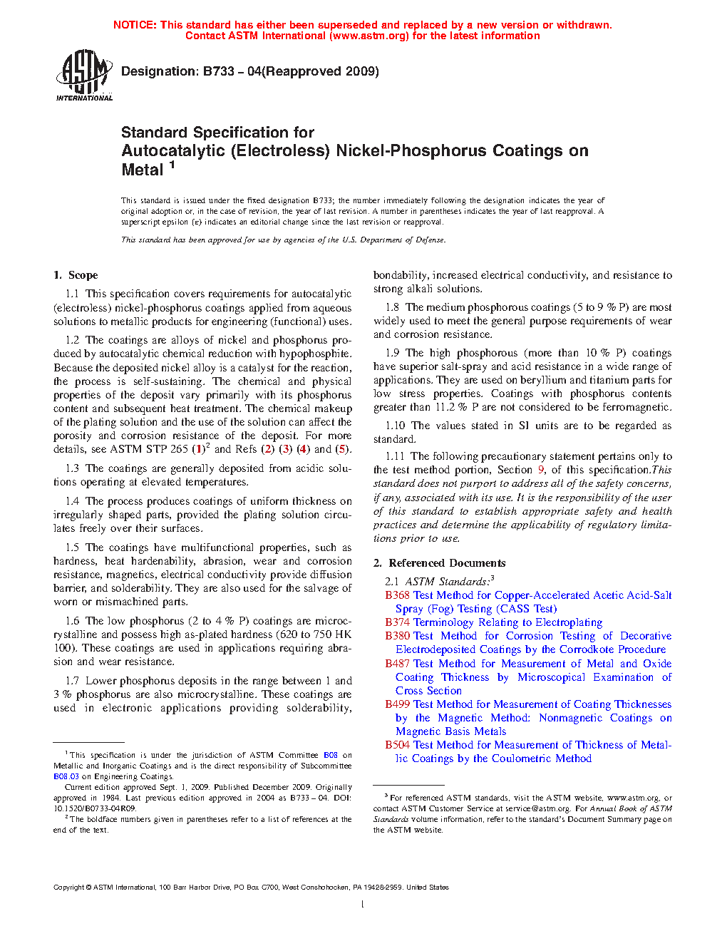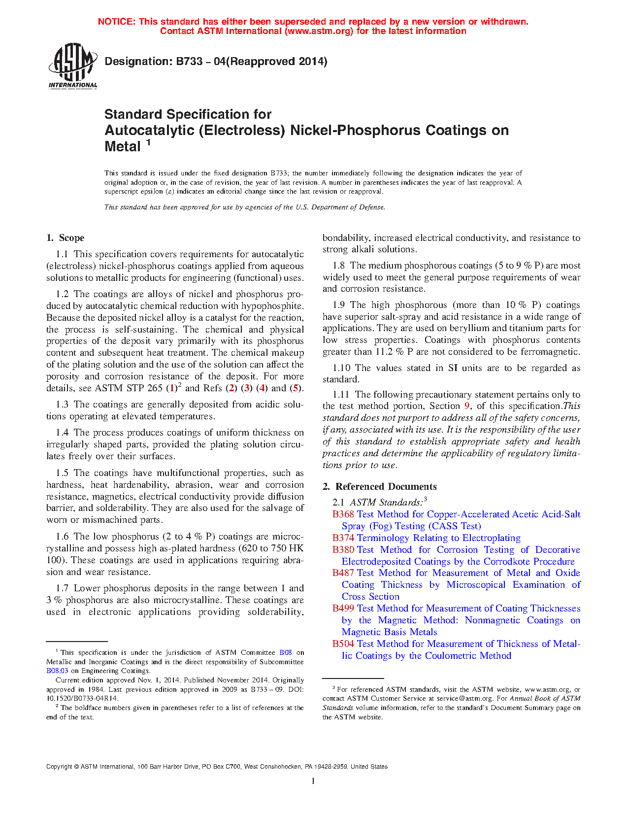 1.1 This specification covers requirements for autocatalytic (electroless) nickel-phosphorus coatings applied from aqueous solutions to metallic products for engineering (functional) uses.