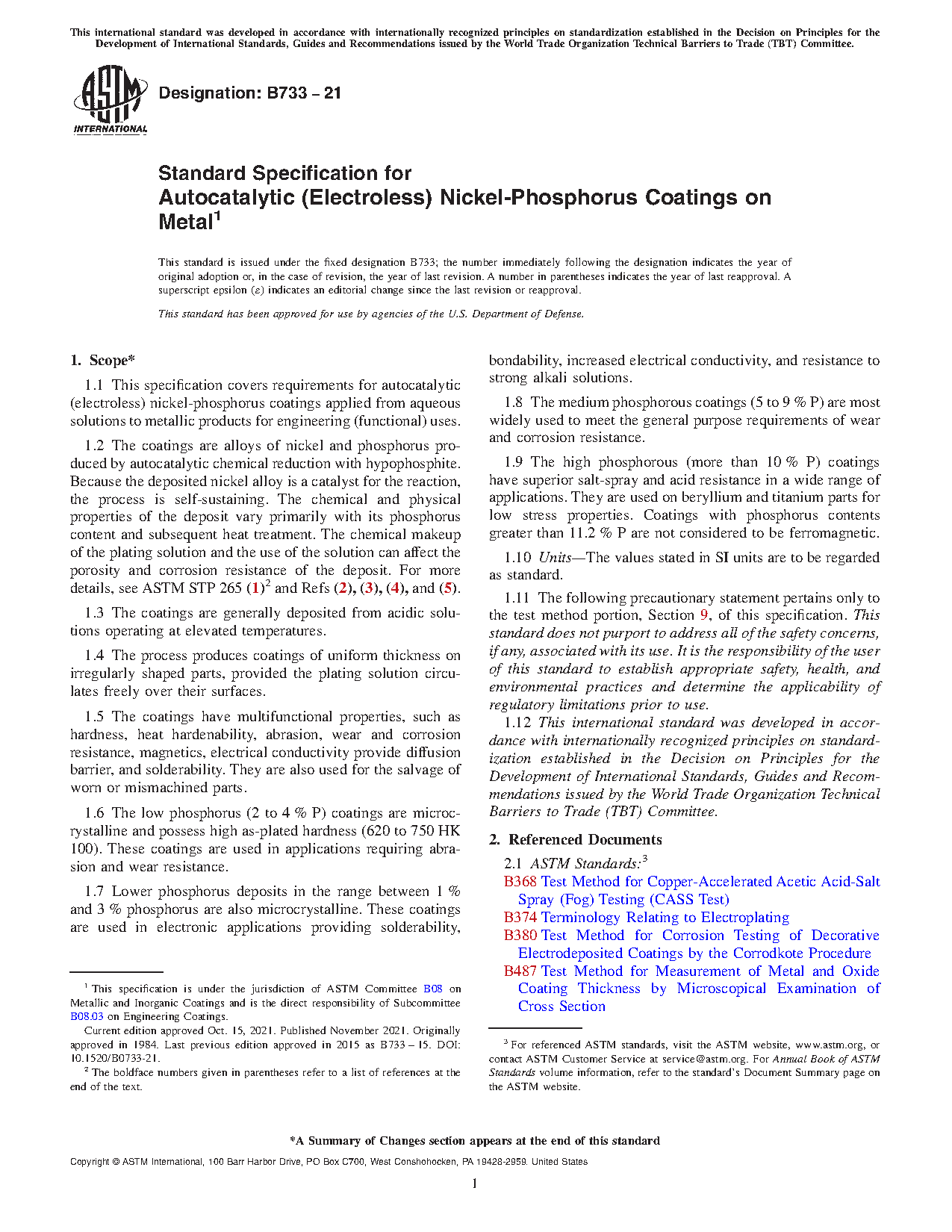 This specification establishes the requirements for autocatalytic (electroless) nickel-phosphorus coatings applied from acidic aqueous solutions to metallic products for use in engineering functions operating at elevated temperatures. The coatings covered here are alloys of nickel and phosphorus produced by self-sustaining autocatalytic chemical reduction with hypophosphite. The coatings are grouped into the following classification systems: types, which are based on the general composition with respect to phosphorus; service condition numbers, which are based on the severity of exposure to which the coating is intended to perform and the corresponding minimum thickness that will provide satisfactory performance; and post heat treatment class, which are based on post-plating heat treatment temperature and time to produce the desired adhesion and hardness improvements. Prior to plating, substrates should be pretreated by stress relief for reducing risks of hydrogen embrittlement, peening, and racking. The coatings shall be sampled and tested accordingly to evaluate both acceptance (appearance, thickness, adhesion, and porosity) and qualification requirements (composition, microhardness, and hydrogen embrittlement). Thickness shall be assessed either by microscopical method, a magnetic induction instrument, beta backscatter method, a micrometer, weigh-plate-weigh method, coulometric method, or X-ray spectrometry. Adhesion shall be examined either by bend, impact, or thermal shock tests. And porosity shall be inspected either by ferroxyl test, boiling water test, aerated water test, or alizarin test.