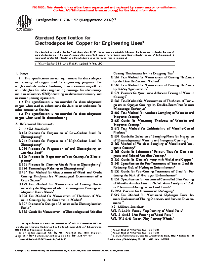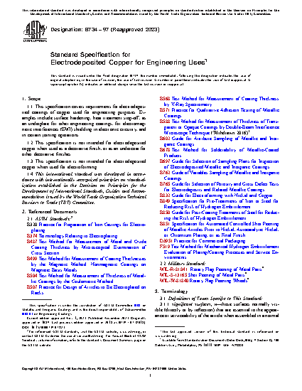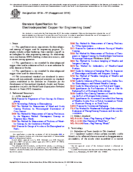 1.1 This specification covers requirements for electrodeposited coatings of copper used for engineering purposes. Examples include surface hardening, heat treatment stop-off, as an underplate for other engineering coatings, for electromagnetic interferences (EMI) shielding in electronic circuitry, and in certain joining operations.