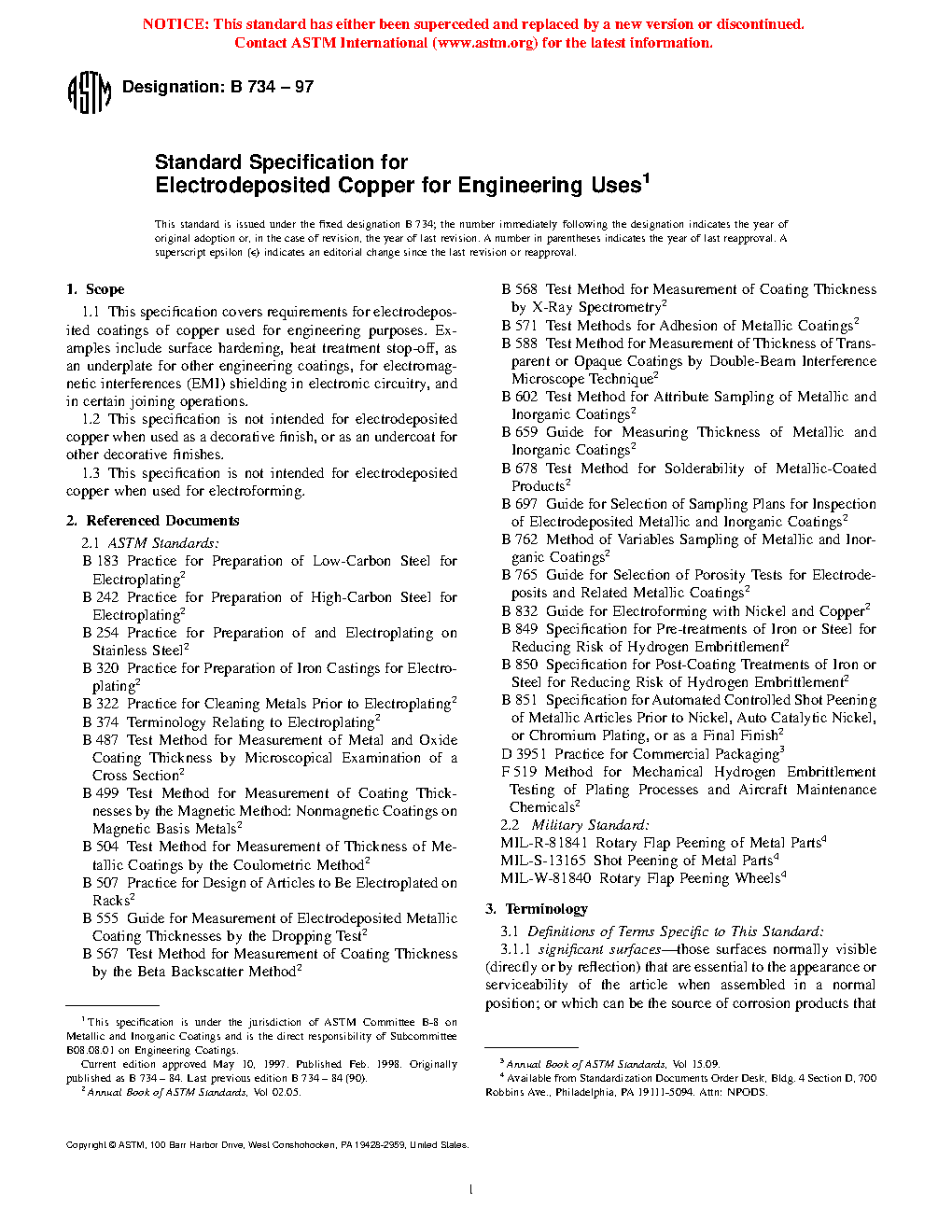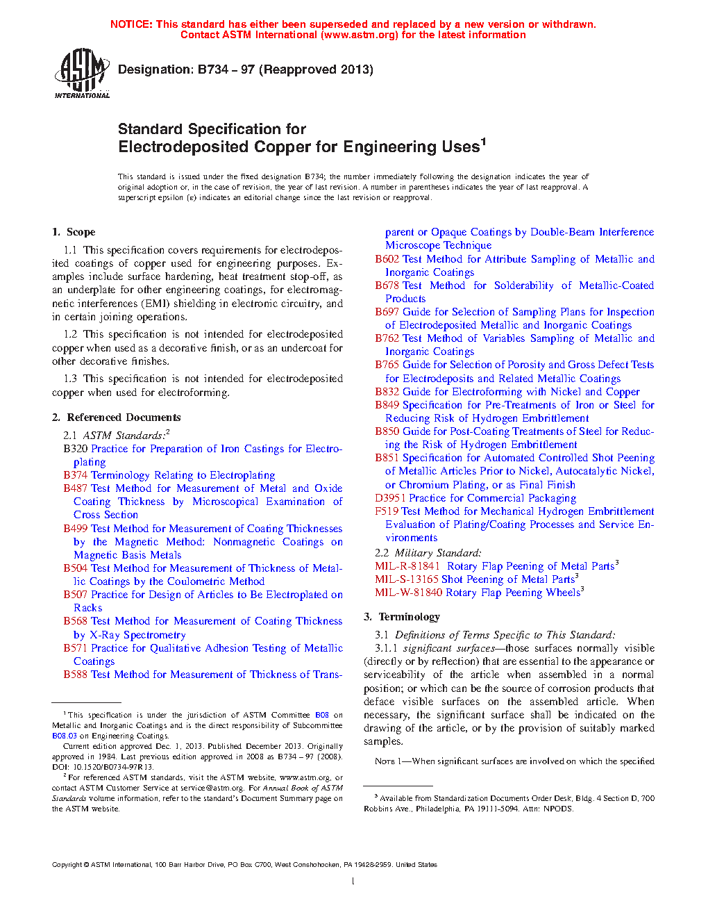 This specification establishes the requirements for electrodeposited copper coatings used for engineering purposes including surface hardening, heat treatment stop-off, as an underplate for other engineering coatings, for electromagnetic interference shielding in electronic circuitry, and in certain joining operations. This specification does not cover electrodeposited copper used as a decorative finish, as an undercoat for other decorative finishes, or for electroforming. Coatings shall be classified according to thickness. Metal parts shall undergo pre- and post-coating treatment for reducing the risk of hydrogen embrittlement, and peening. Coatings shall be sampled, tested, and shall conform to specified requirements as to appearance, thickness, porosity, solderability, adhesion, embrittlement relief, and packaging.