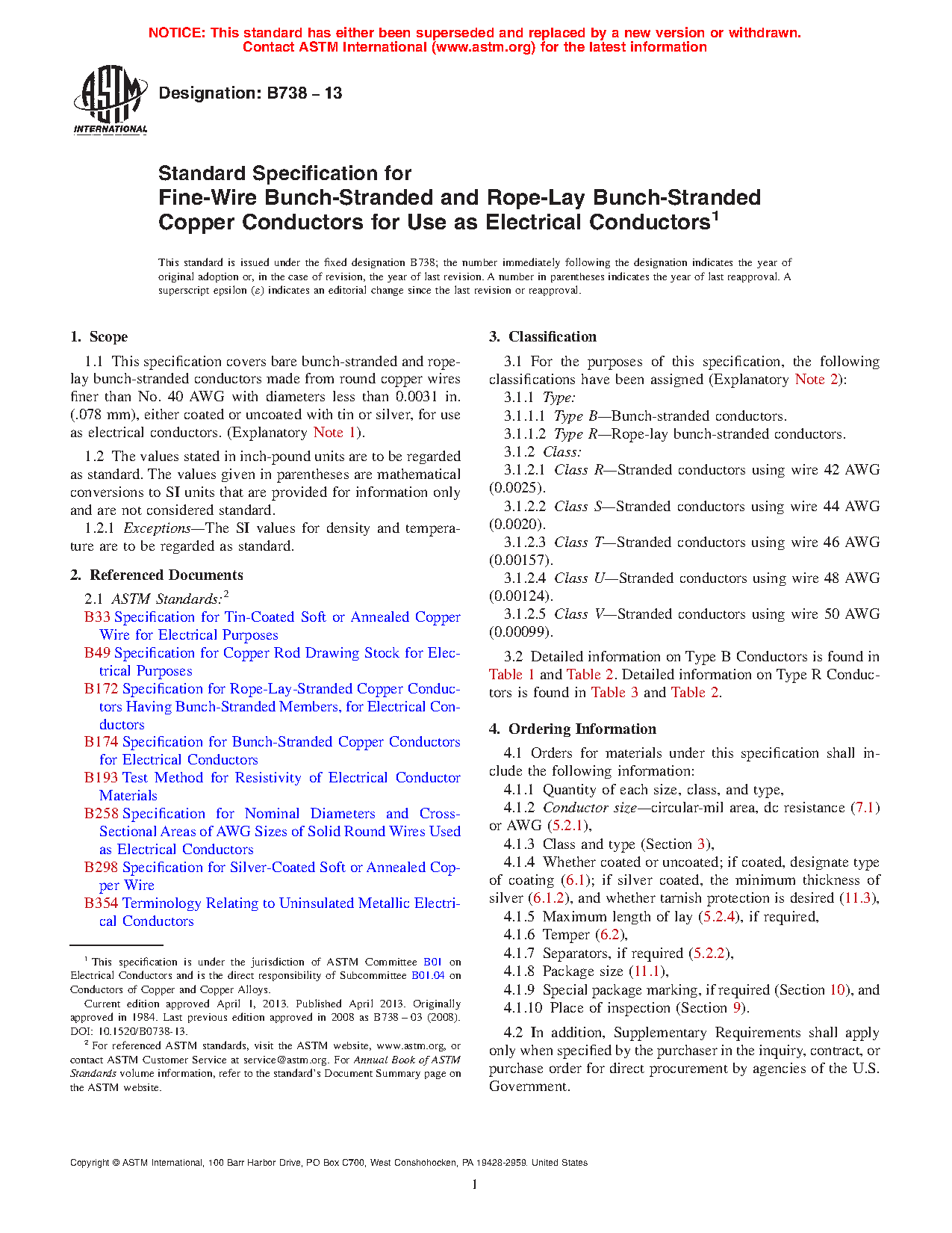 1.1 This specification covers bare bunch-stranded and rope-lay bunch-stranded conductors made from round copper wires finer than No. 40 AWG with diameters less than 0.0031 in. (.078 mm), either coated or uncoated with tin or silver, for use as electrical conductors. (Explanatory Note 1).