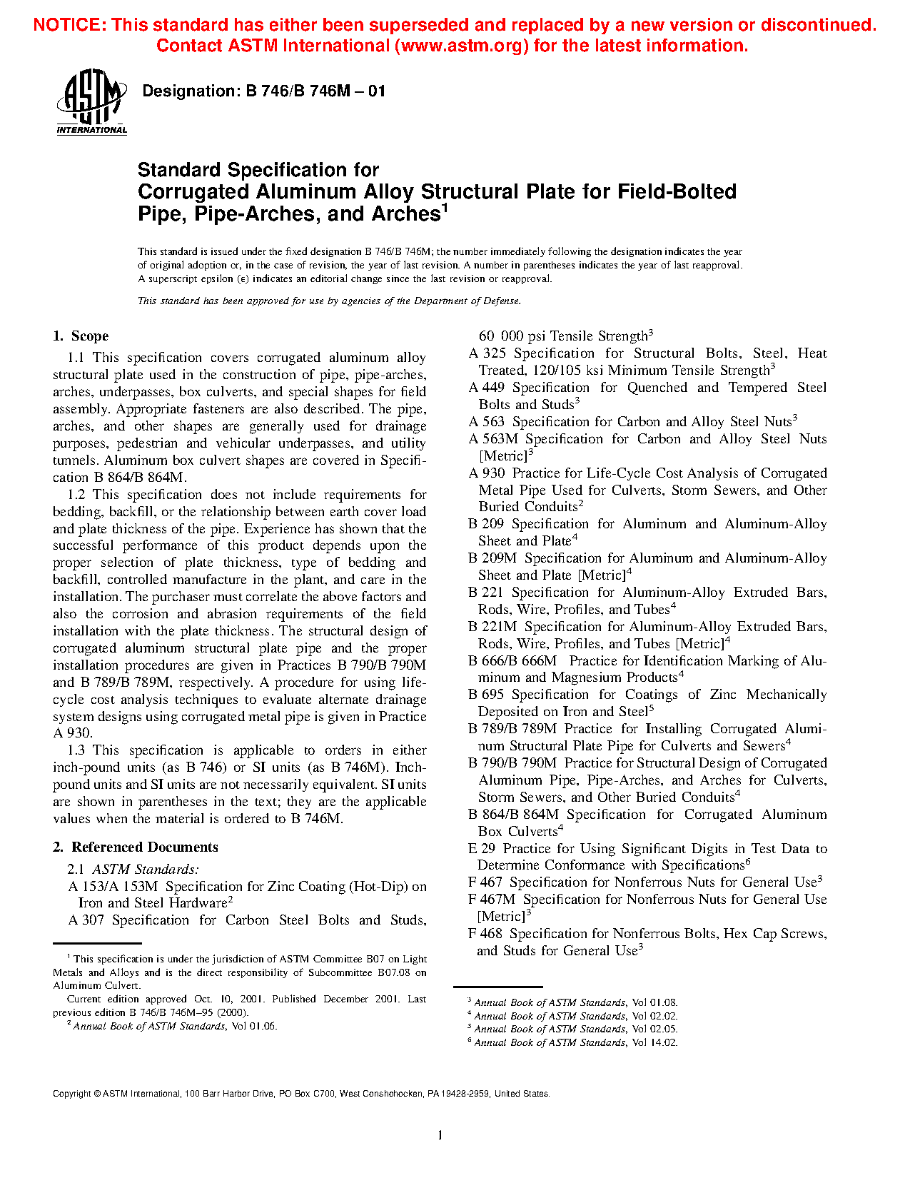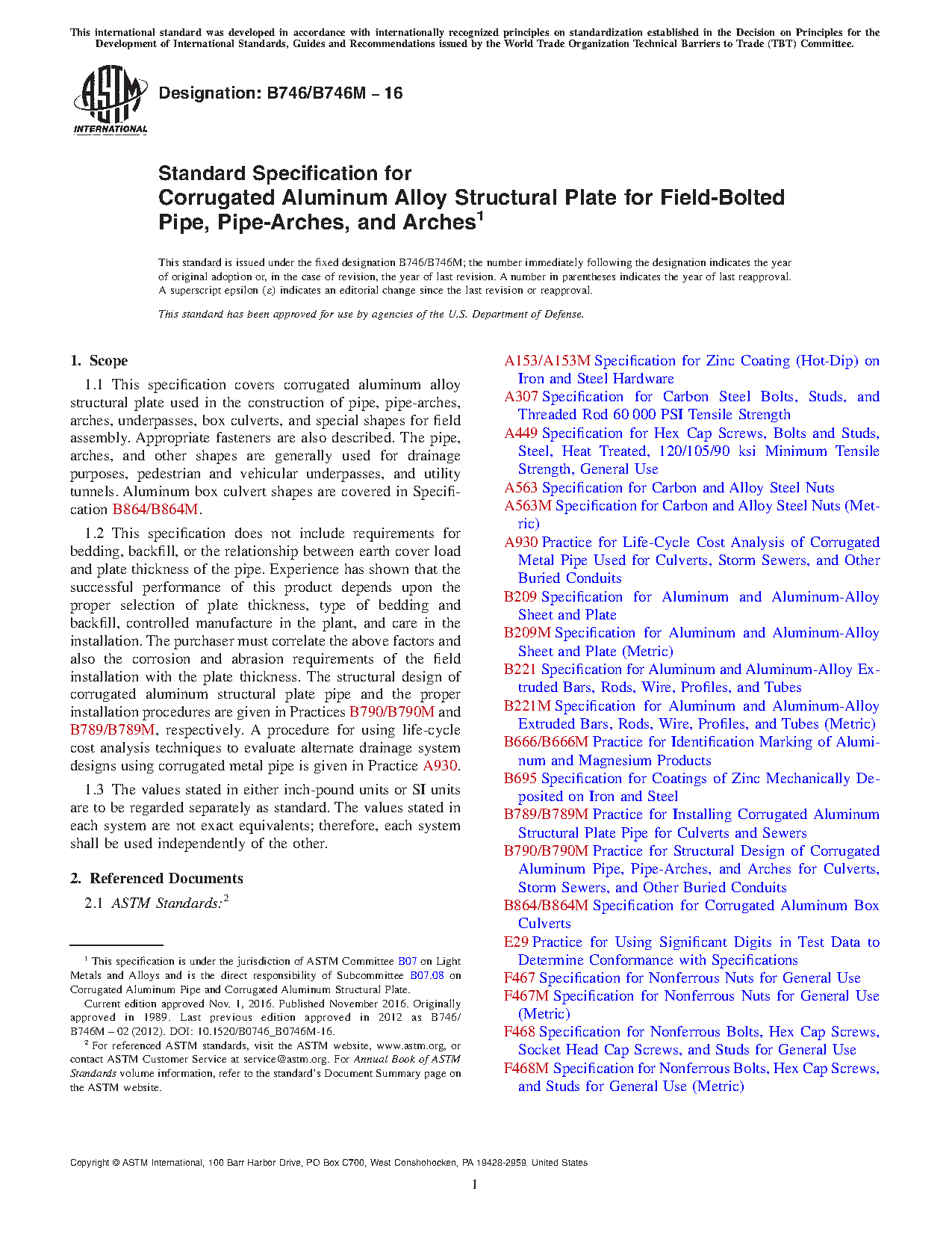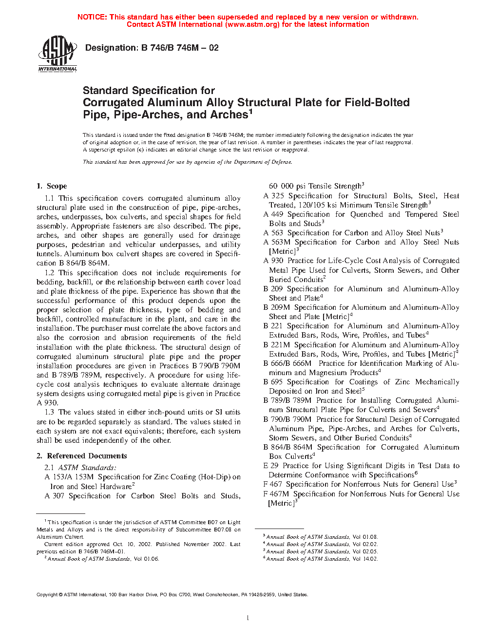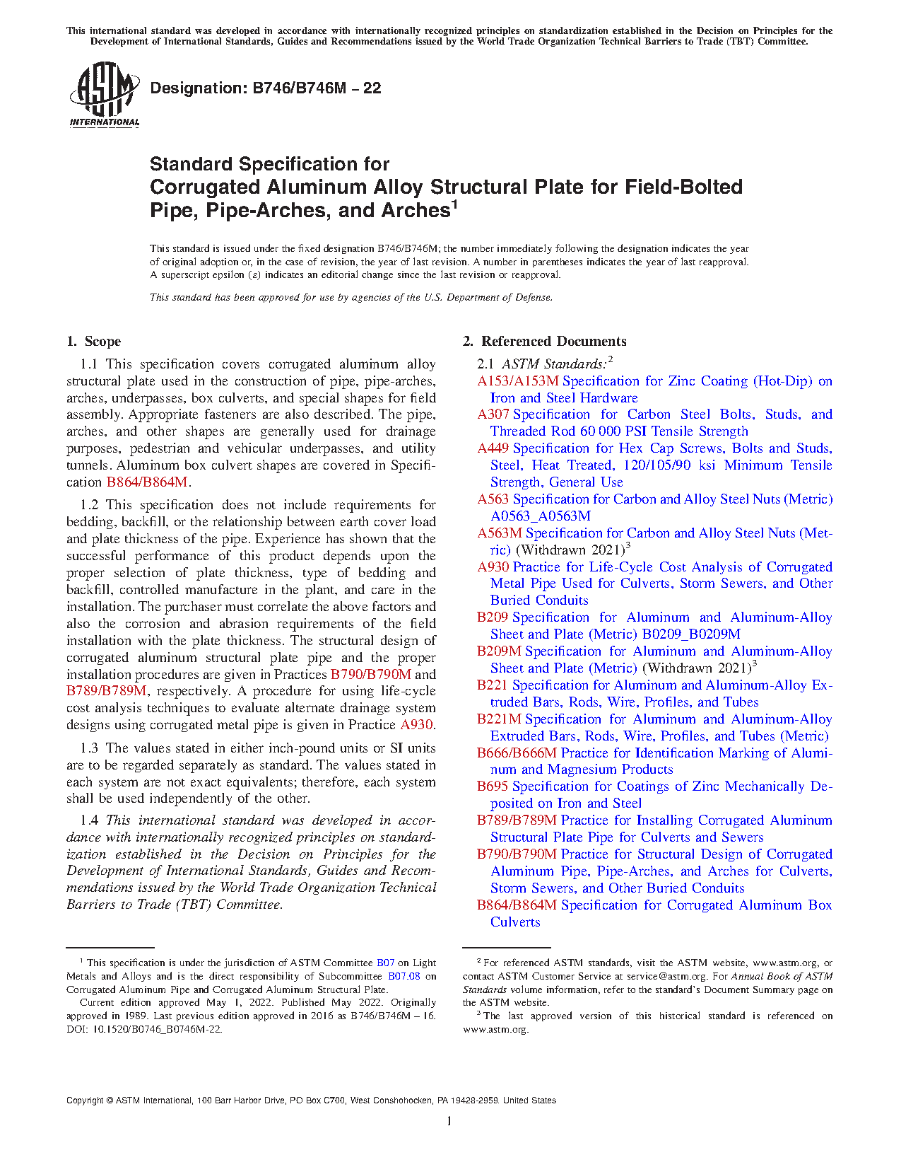 1.1 This specification covers corrugated aluminum alloy structural plate used in the construction of pipe, pipe-arches, arches, underpasses, box culverts, and special shapes for field assembly. Appropriate fasteners are also described. The pipe, arches, and other shapes are generally used for drainage purposes, pedestrian and vehicular underpasses, and utility tunnels. Aluminum box culvert shapes are covered in Specification B864/B864M.