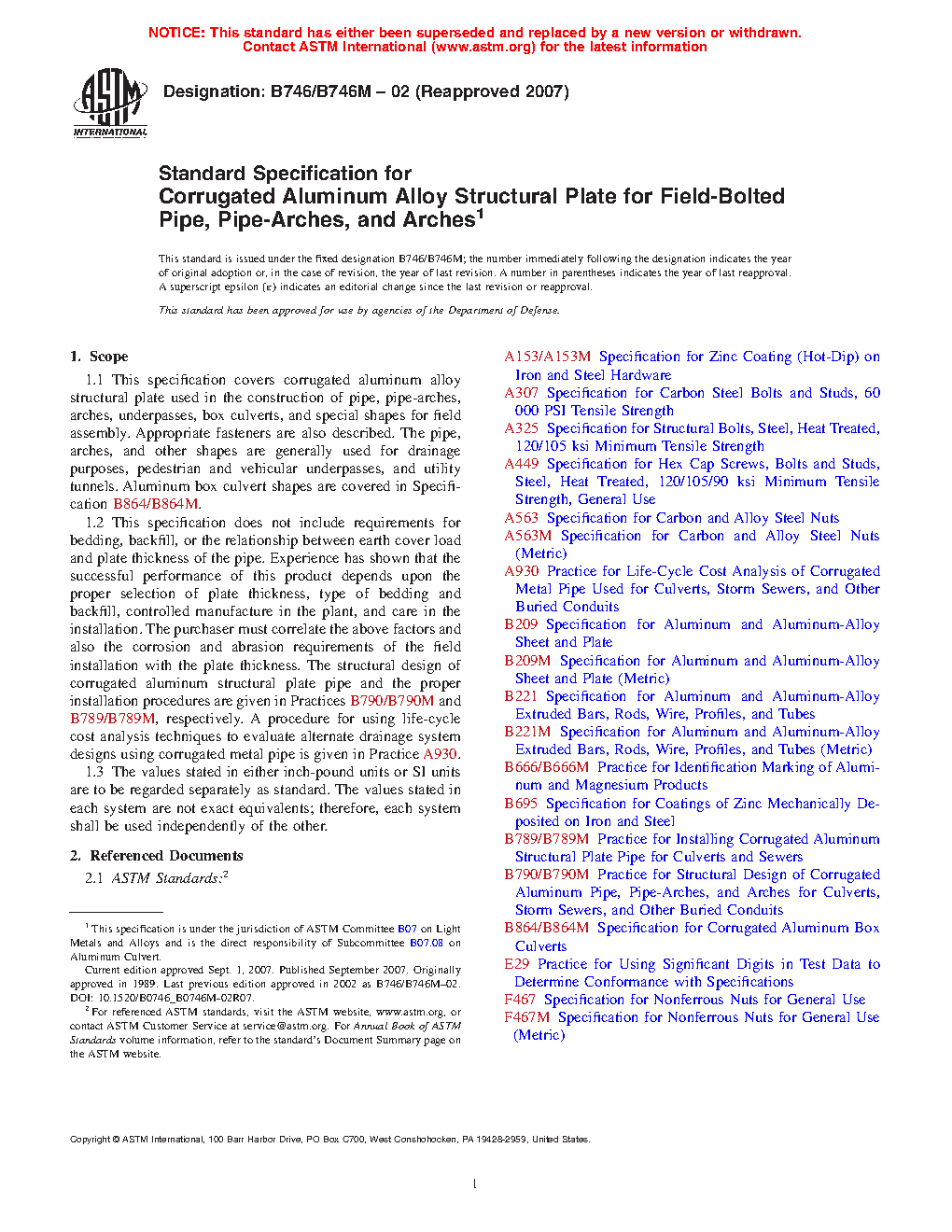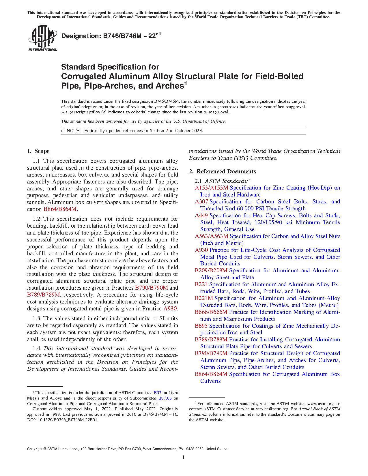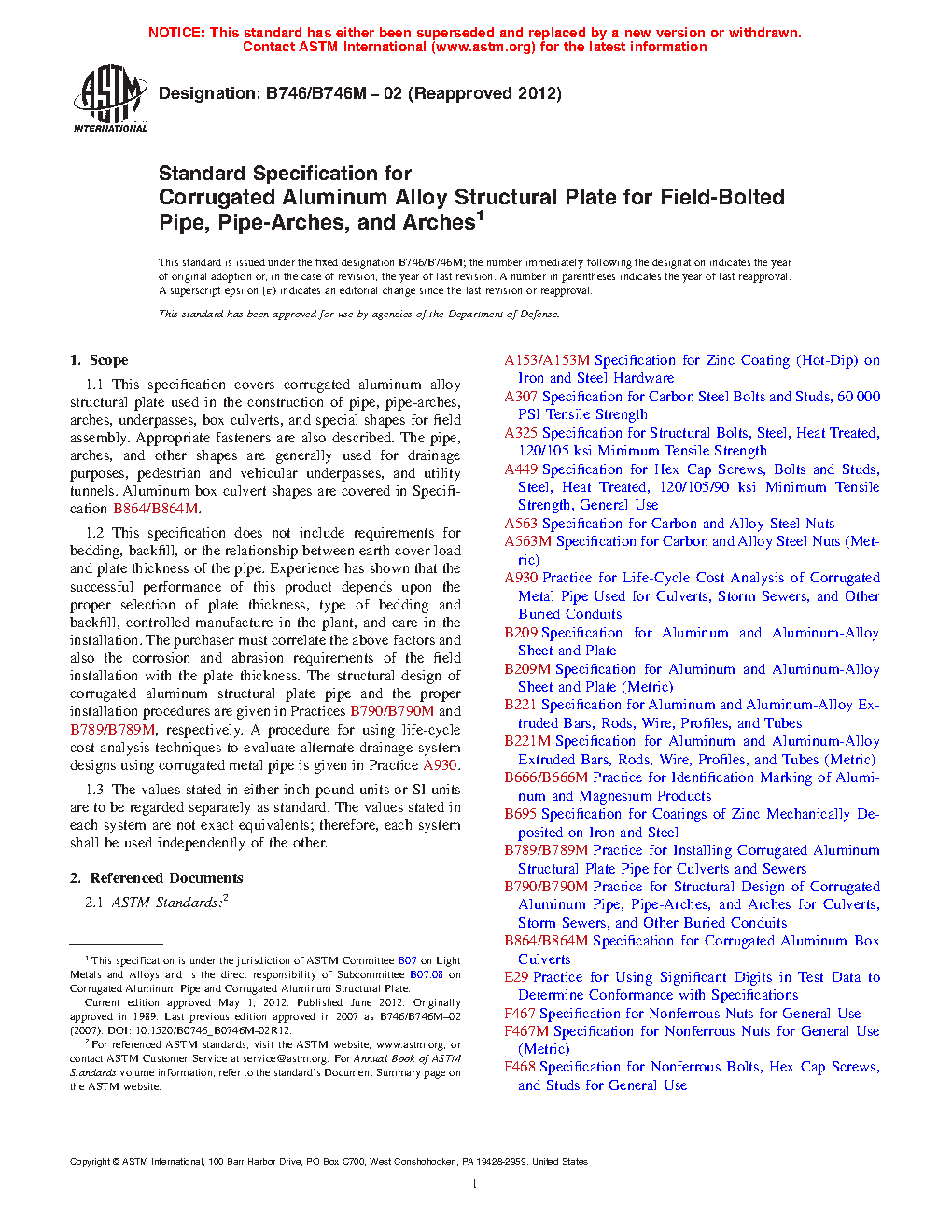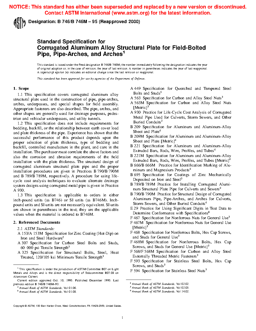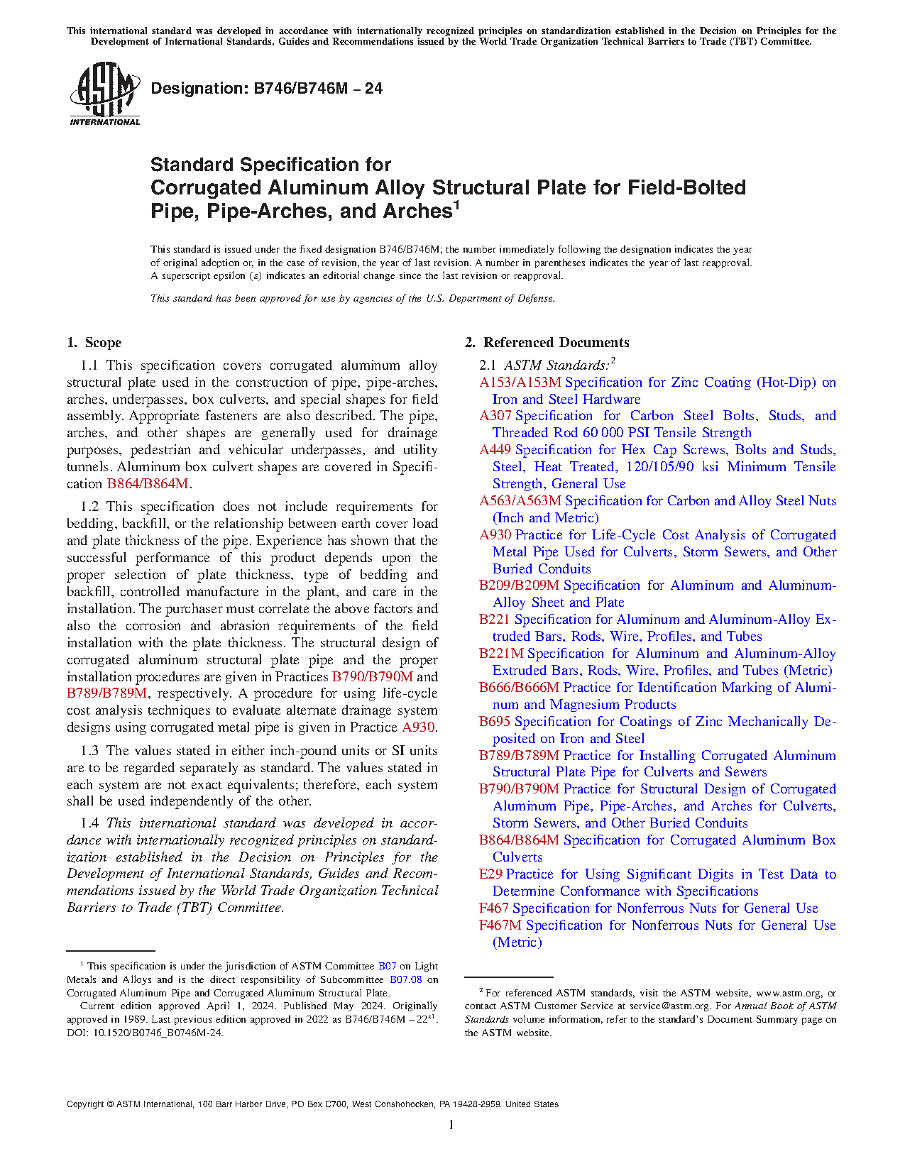 1.1 This specification covers corrugated aluminum alloy structural plate used in the construction of pipe, pipe-arches, arches, underpasses, box culverts, and special shapes for field assembly. Appropriate fasteners are also described. The pipe, arches, and other shapes are generally used for drainage purposes, pedestrian and vehicular underpasses, and utility tunnels. Aluminum box culvert shapes are covered in Specification B864/B864M.
