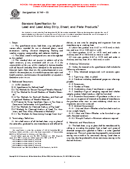 1.1 This specification covers lead sheet, strip, and plate of various alloys intended for use in chemical plants, sound attenuation, roofing, vibration dampening, flashing and weather stripping, waterproofing, and radiation shielding.