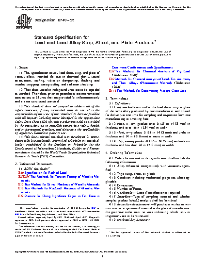 This specification covers the standard requirements for lead and lead alloy strip, sheet, and plate products intended for use in chemical plants, sound attenuation, roofing, vibration dampening, flashing and weather stripping, waterproofing, and radiation shielding. The lead sheet, strip, or plate shall be manufactured by rolling or extruding the product from a lead work piece which may be prepared by conventional casting into a mold or by direct continuous casting. Chemical analysis shall be performed on the samples which shall be taken during pouring the casting prior to working or during subsequent processing, such as rolling or cutting. The material shall conform to the product analysis variation in the chemical composition specifications for antimony, arsenic, tin, copper, silver, bismuth, zinc, tellurium, nickel, iron, and lead. Tension and hardness tests shall also be conducted on the specimens which shall be taken in the direction of rolling from the material in the final condition of rolling and heat treatment or in the case of continuously cast sheet in the casting direction and as cast state. The lead products shall be uniform in quality and hardness, smooth, commercially straight and flat, and free of injurious imperfections such as pits, dents, scratches, laminations, grit, foreign matter, porosity, or waves that may affect the serviceability of material.