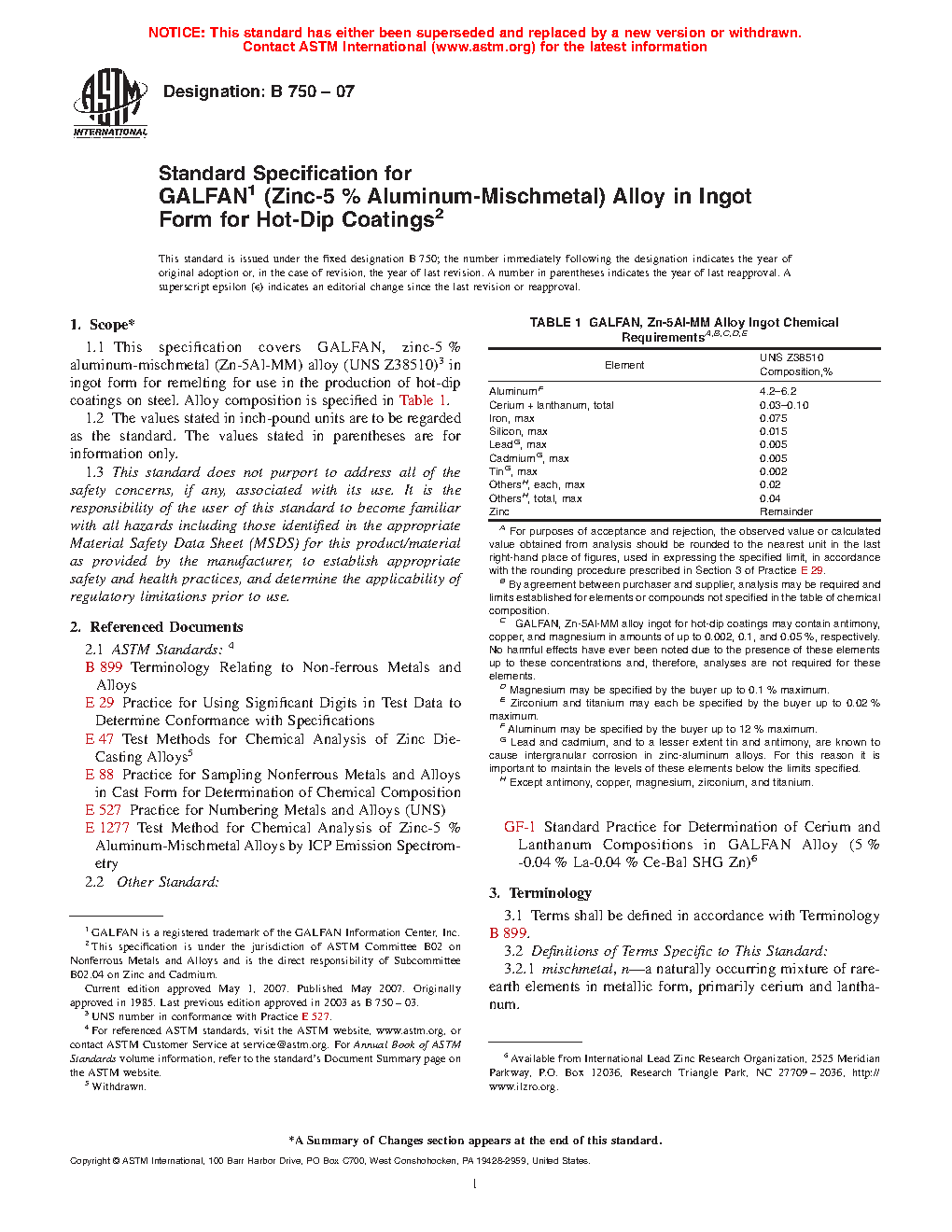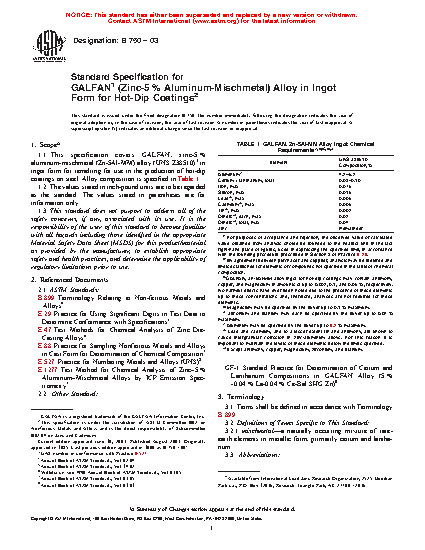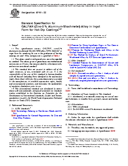 1.1 This specification covers GALFAN, zinc-5 % aluminum-mischmetal (Zn-5Al-MM) alloy (UNS Z38510) in ingot form for remelting for use in the production of hot-dip coatings on steel. Alloy composition is specified in Table 1.