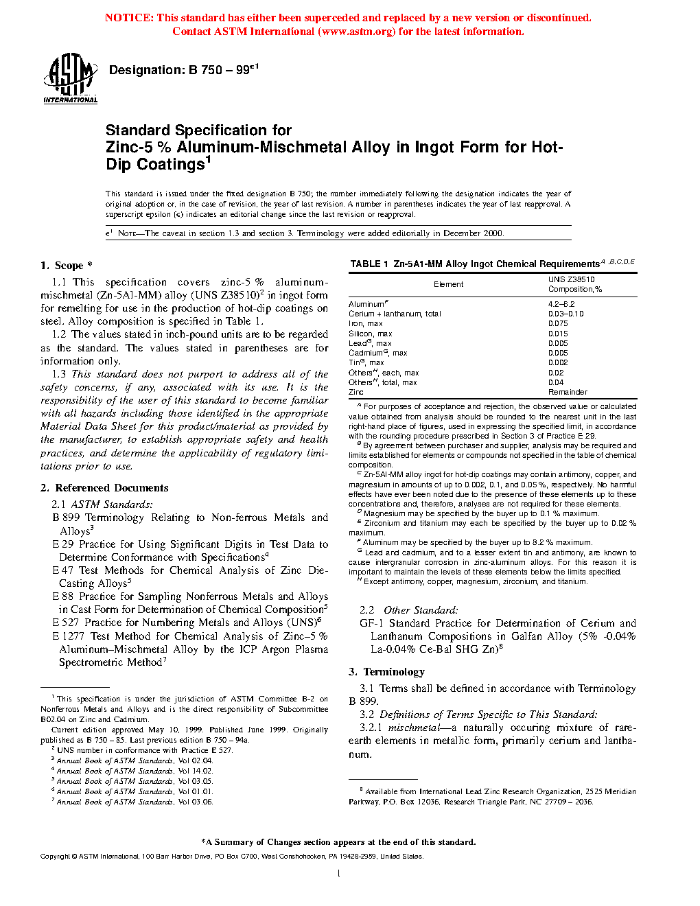 TABLE 1 GALFAN, Zn-5Al-MM Alloy Ingot Chemical
