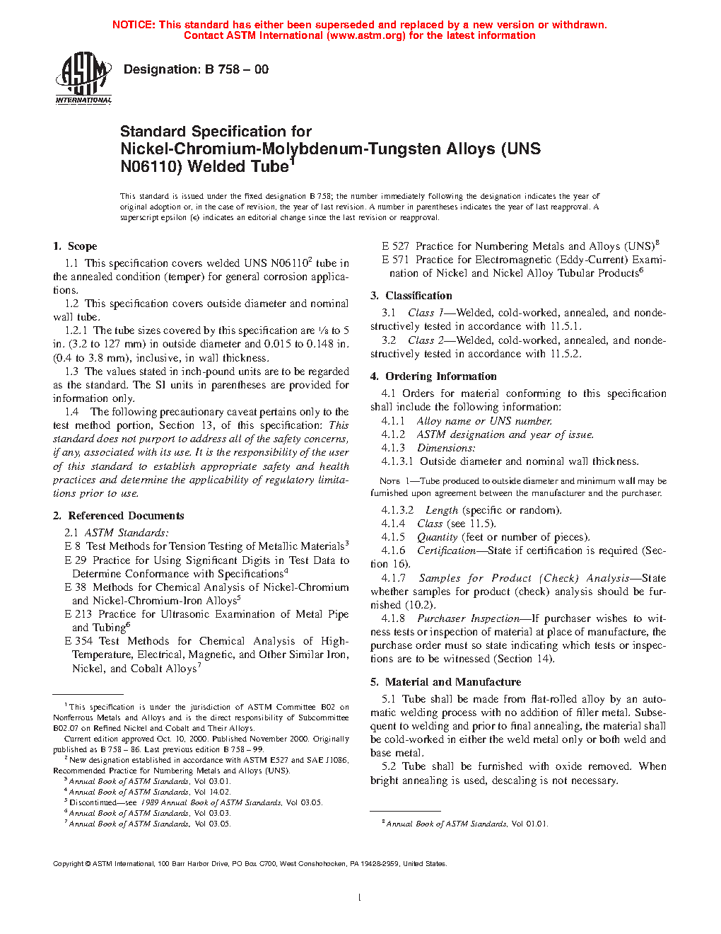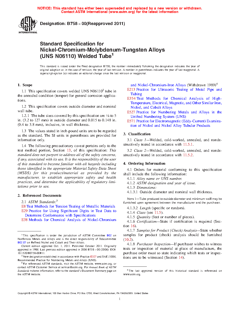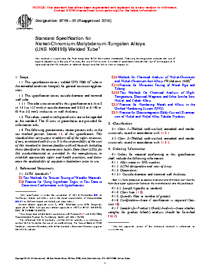 This specification covers welded nickel-chromium-molybdenum-tungsten alloy (UNS N06110) tube in the annealed condition (temper) for general corrosion applications. The tube shall be made from flat-rolled alloy by an automatic welding process with no addition of filler material. Subsequent to welding and prior to final annealing, the material shall be cold-worked in either the weld metal only or both weld and base metal. The tube shall be furnished with oxide removed. When bright annealing is used, descaling is not necessary. Flattening, flange, and nondestructive tests shall be performed on the tube.