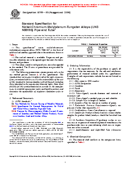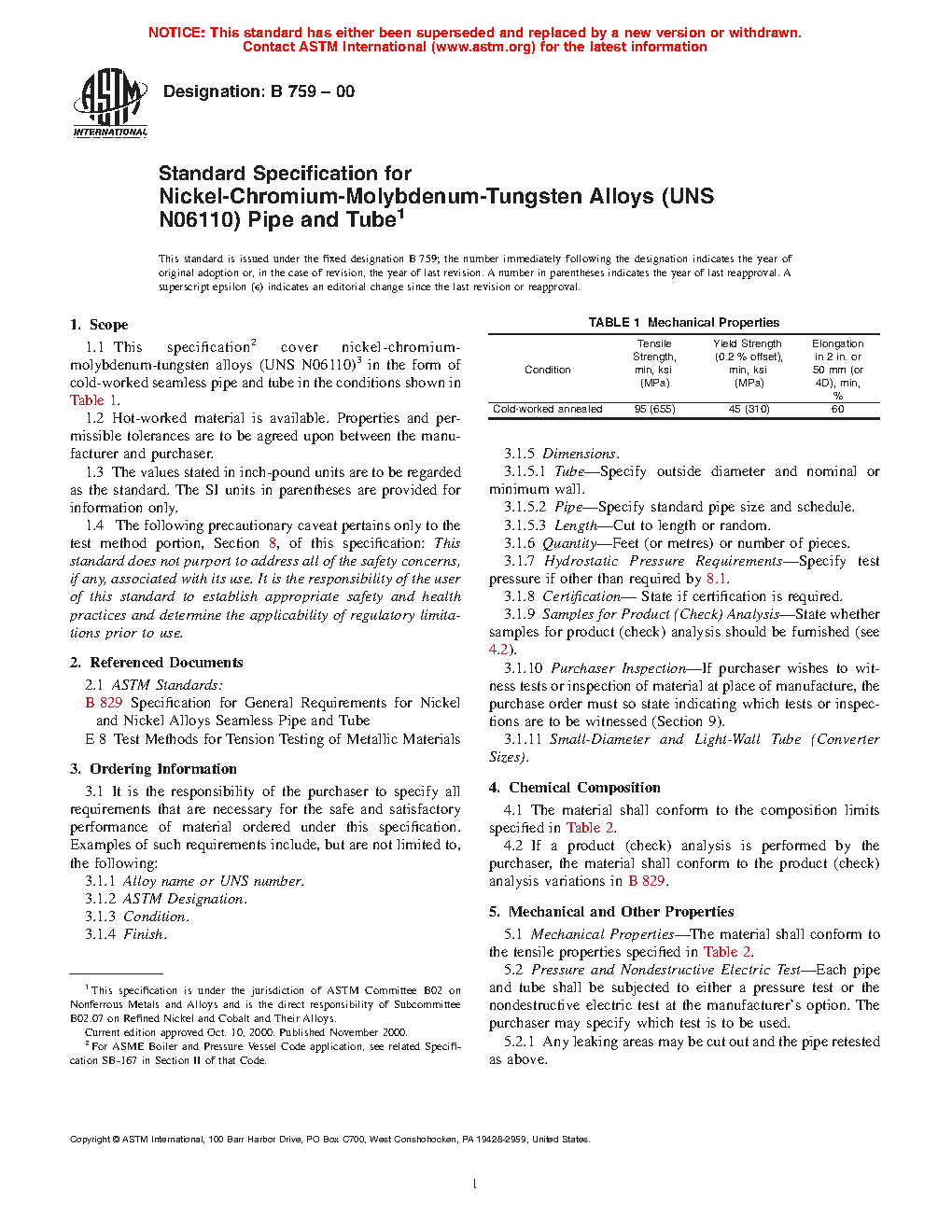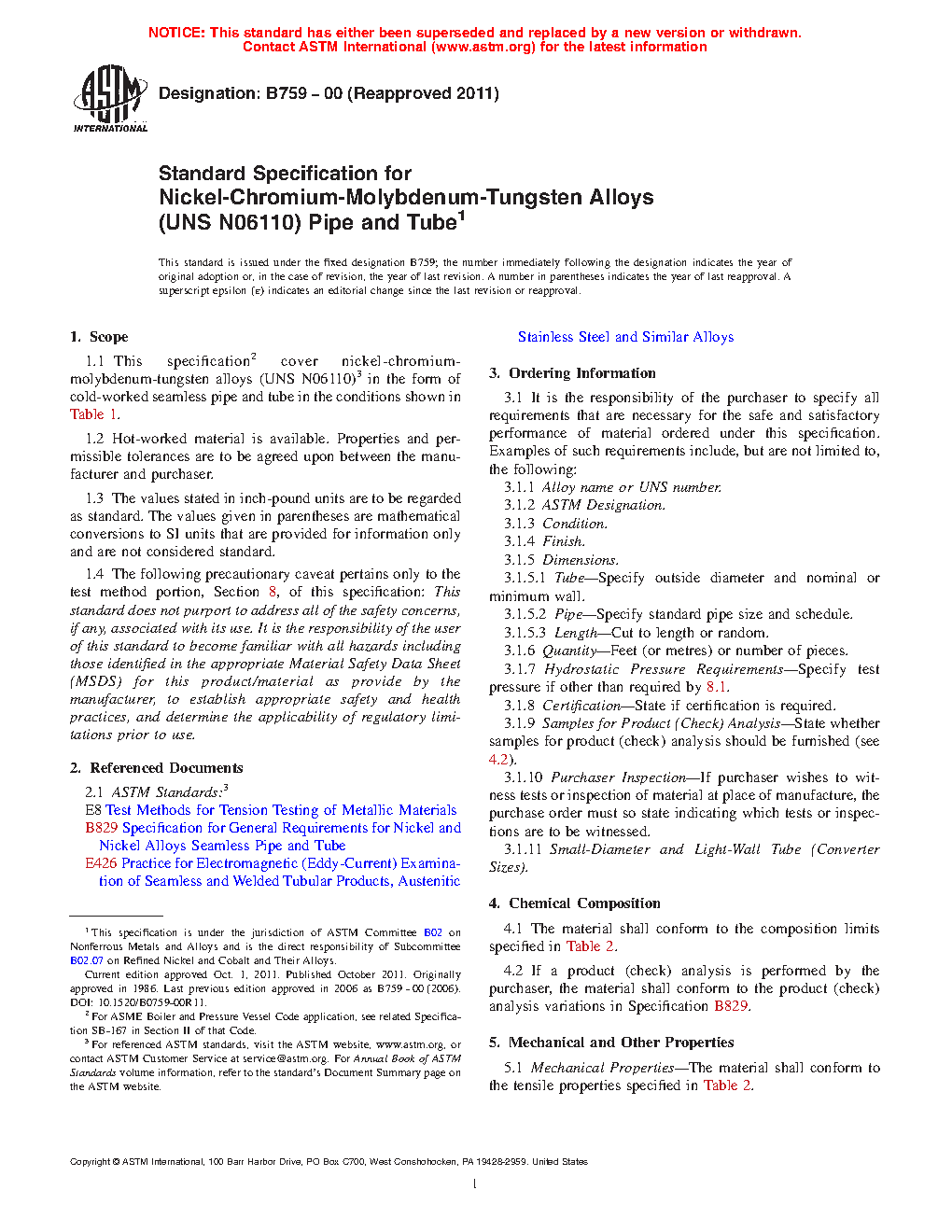 1.1 This specification2 cover nickel-chromium-molybdenum-tungsten alloys (UNS N06110)3 in the form of cold-worked seamless pipe and tube in the conditions shown in Table 1.