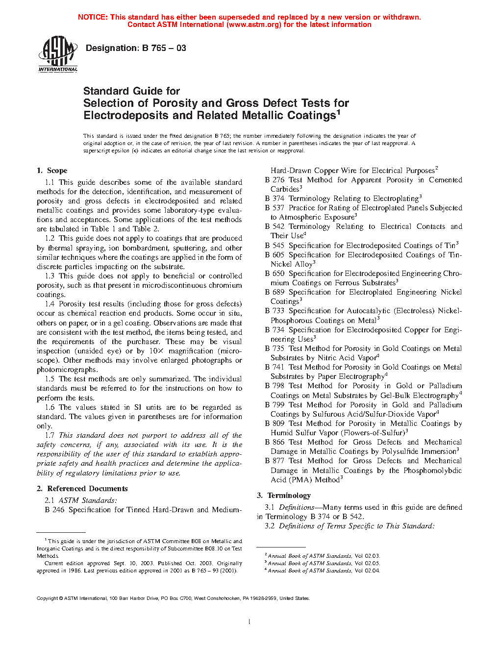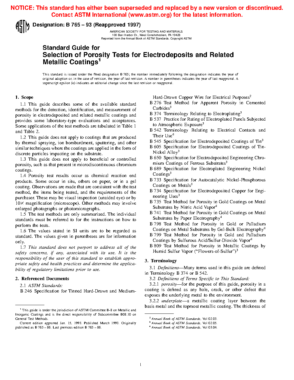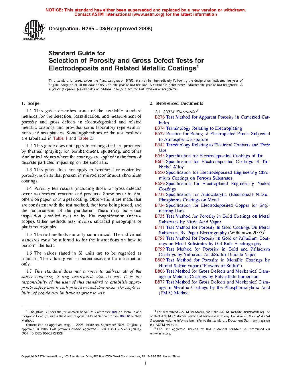 1.1 This guide describes some of the available standard methods for the detection, identification, and measurement of porosity and gross defects in electrodeposited and related metallic coatings and provides some laboratory-type evaluations and acceptances. Some applications of the test methods are tabulated in Table 1 and Table 2.