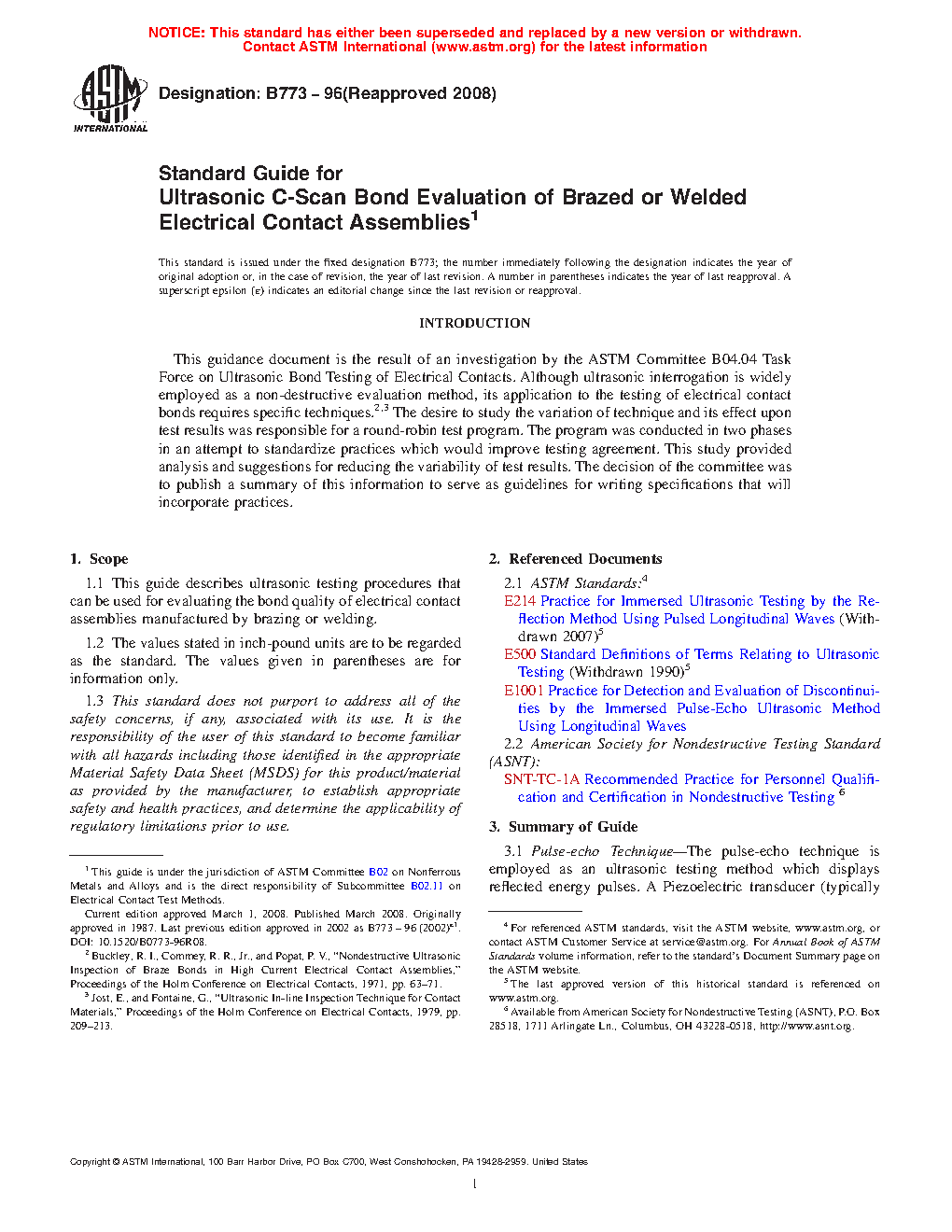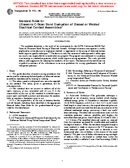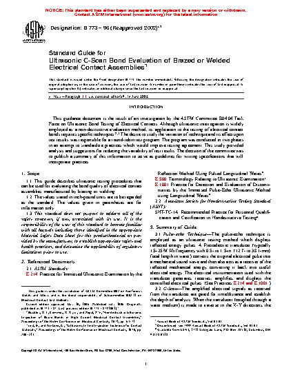 1.1 This guide describes ultrasonic testing procedures that can be used for evaluating the bond quality of electrical contact assemblies manufactured by brazing or welding.
