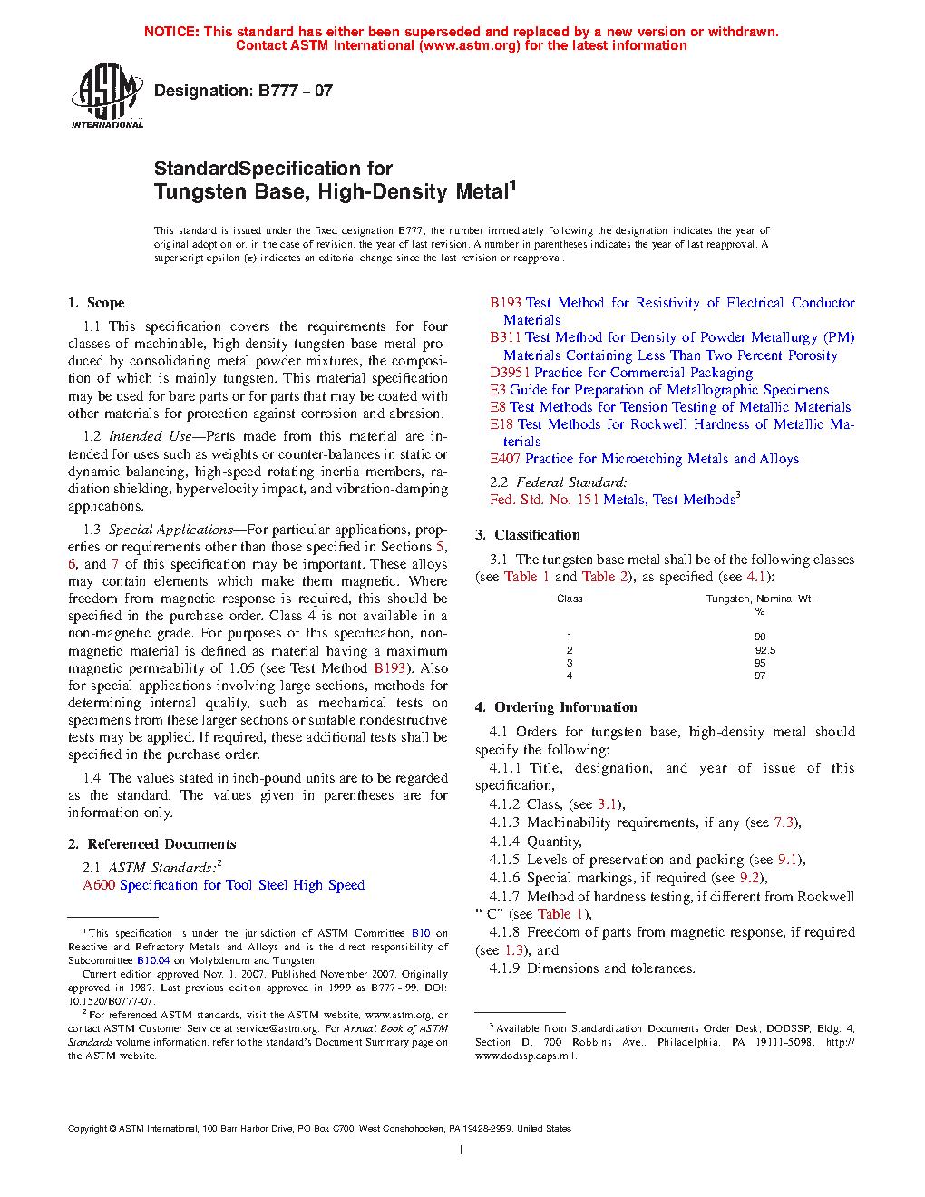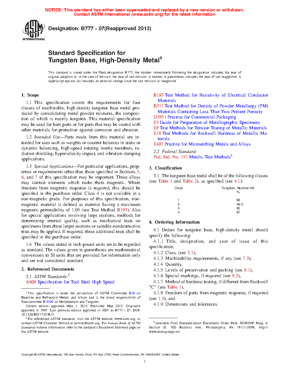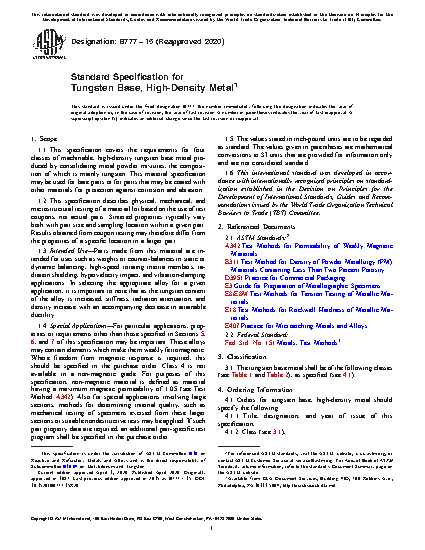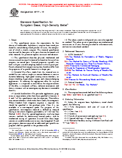 1.1 This specification covers the requirements for four classes of machinable, high-density tungsten base metal produced by consolidating metal powder mixtures, the composition of which is mainly tungsten. This material specification may be used for bare parts or for parts that may be coated with other materials for protection against corrosion and abrasion.
