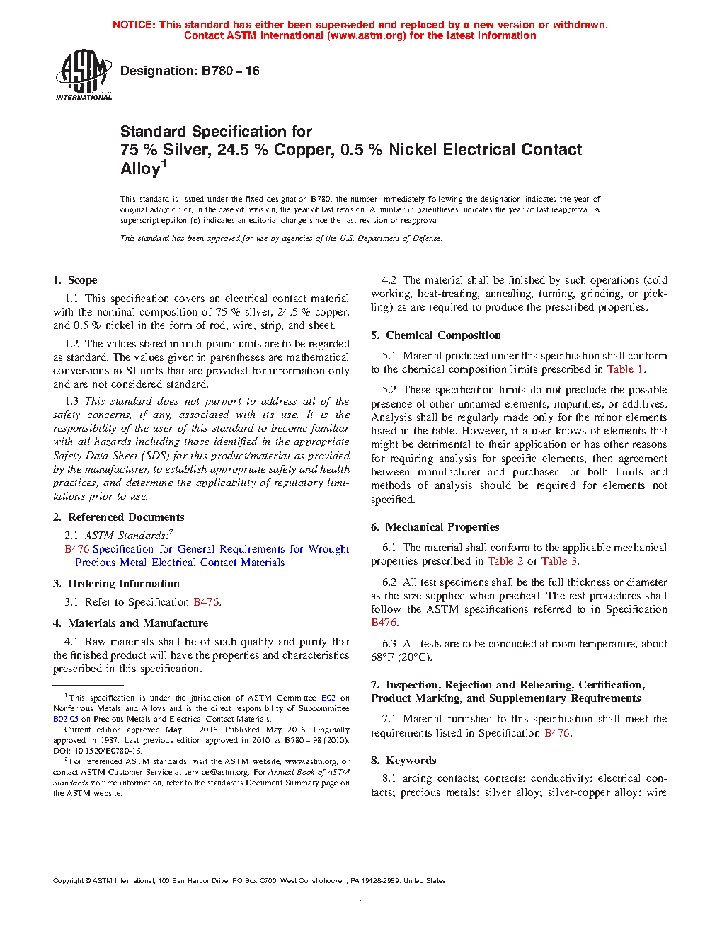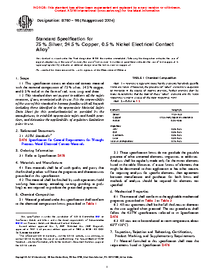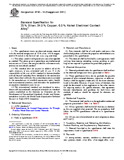 1.1 This specification covers an electrical contact material with the nominal composition of 75 % silver, 24.5 % copper, and 0.5 % nickel in the form of rod, wire, strip, and sheet.