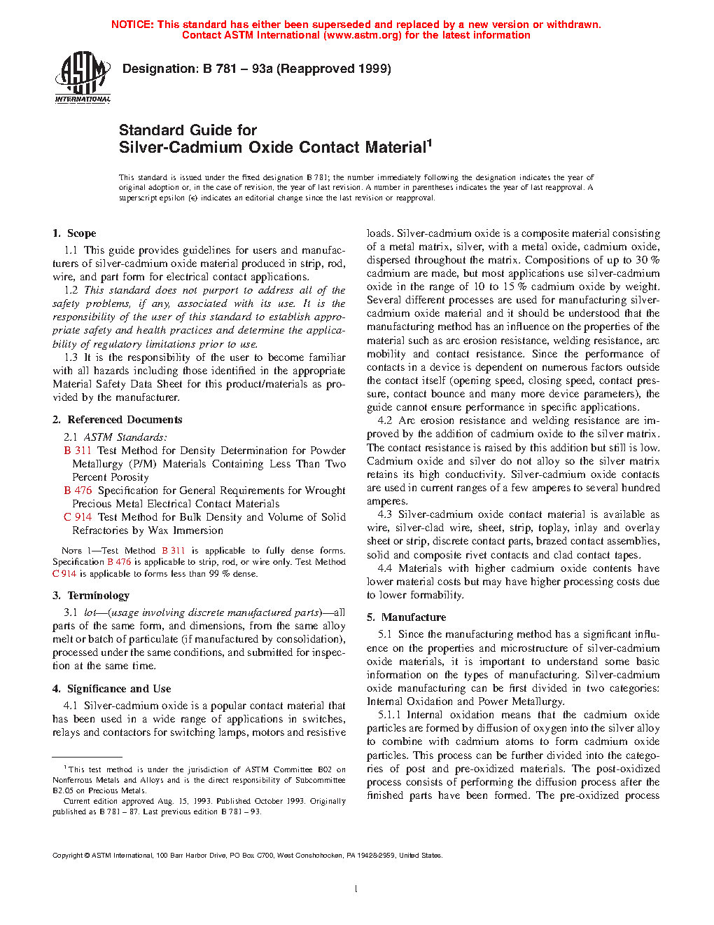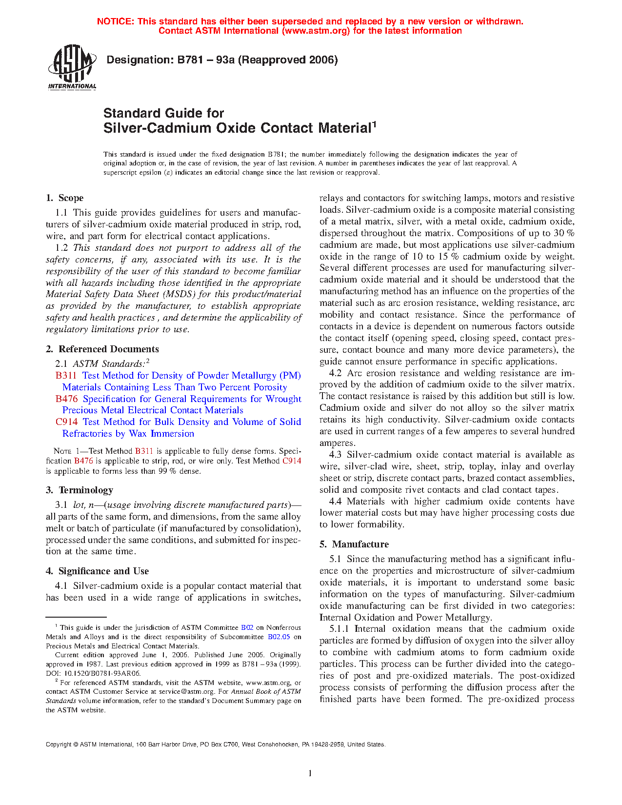 Silver-cadmium oxide is a popular contact material that has been used in a wide range of applications in switches, relays and contactors for switching lamps, motors and resistive loads. Silver-cadmium oxide is a composite material consisting of a metal matrix, silver, with a metal oxide, cadmium oxide, dispersed throughout the matrix. Compositions of up to 30 % cadmium are made, but most applications use silver-cadmium oxide in the range of 10 to 15 % cadmium oxide by weight. Several different processes are used for manufacturing silver-cadmium oxide material and it should be understood that the manufacturing method has an influence on the properties of the material such as arc erosion resistance, welding resistance, arc mobility and contact resistance. Since the performance of contacts in a device is dependent on numerous factors outside the contact itself (opening speed, closing speed, contact pressure, contact bounce and many more device parameters), the guide cannot ensure performance in specific applications.