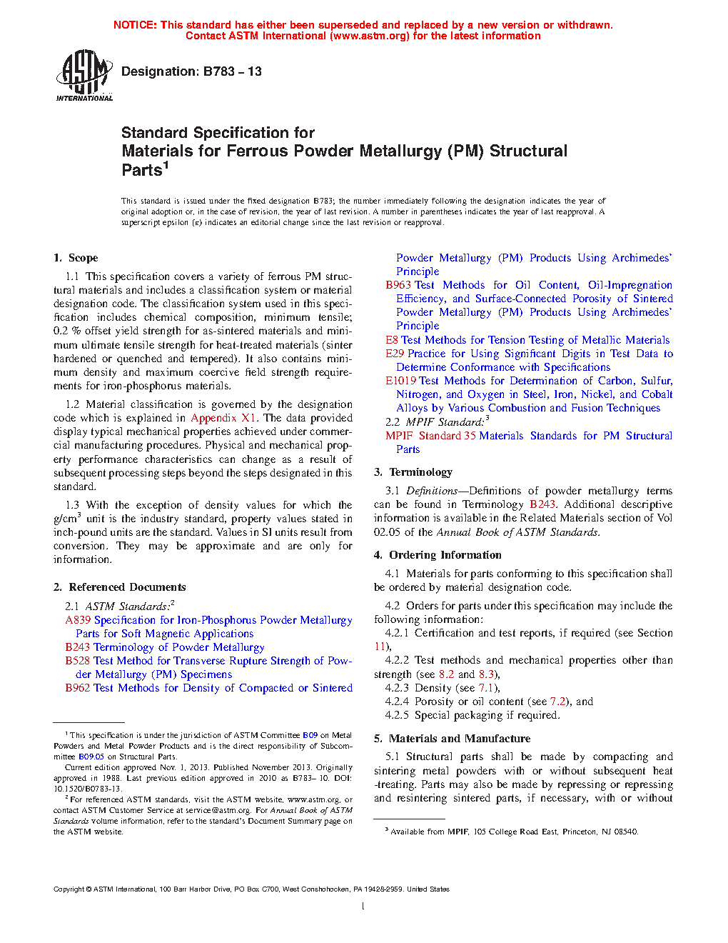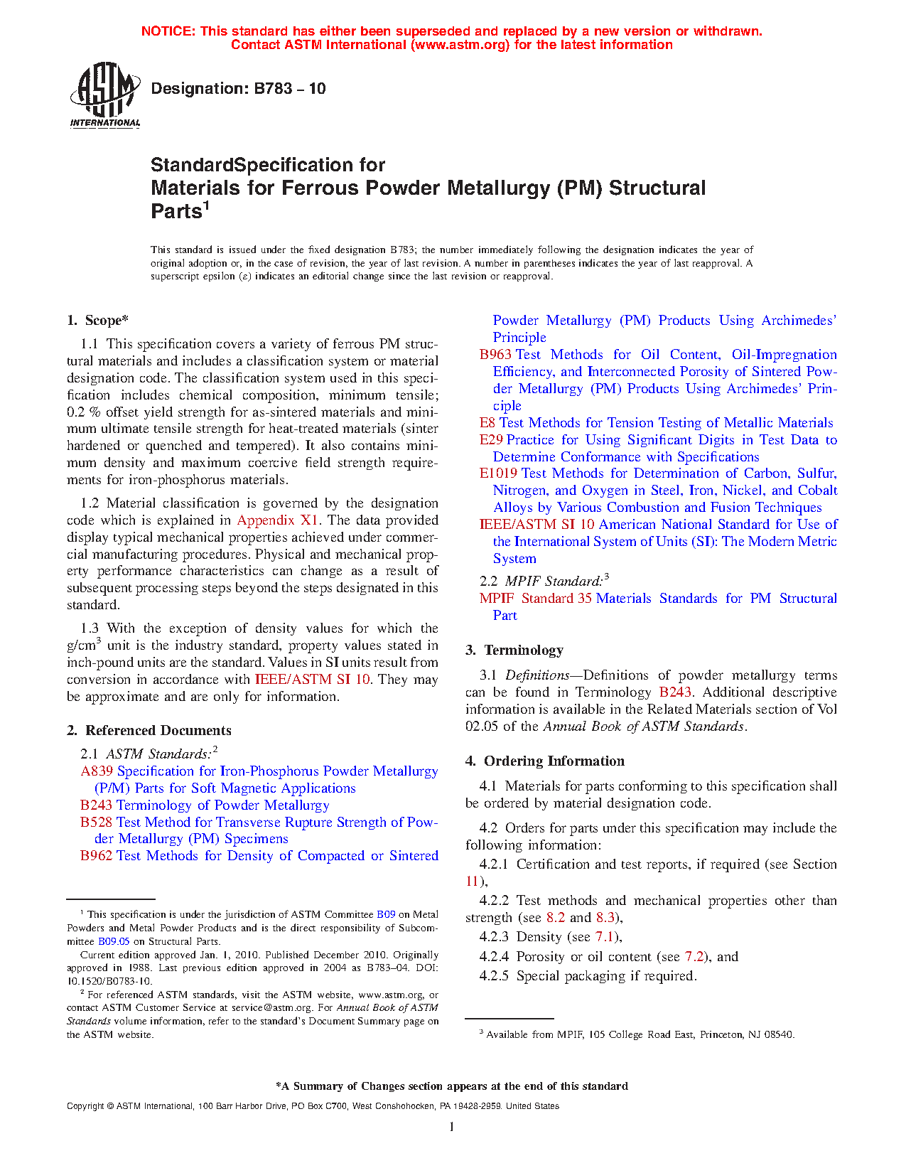 This specification covers a variety of ferrous powder metallurgy structural materials and includes a classification system or material designation code. The classification system includes chemical composition, minimum offset yield strength for as-sintered materials, minimum ultimate tensile strength for heat-treated materials (sinter hardened or quenched and tempered), minimum density, and maximum coercive field strength requirements for iron-phosphorus materials. Structural parts shall be made by pressing and sintering metal powders with or without subsequent heat treatment. Parts may also be made by repressing or repressing and resintering sintered parts, if necessary, with or without subsequent heat treatment to produce finished parts conforming to the requirements of this specification. The material shall conform to the chemical composition requirements for iron, copper, carbon, nickel, molybdenum, chromium, manganese, silicon, sulfur, phosphorus, nitrogen, columbium, and oxygen. The material shall be subjected to chemical analysis and mechanical tests.