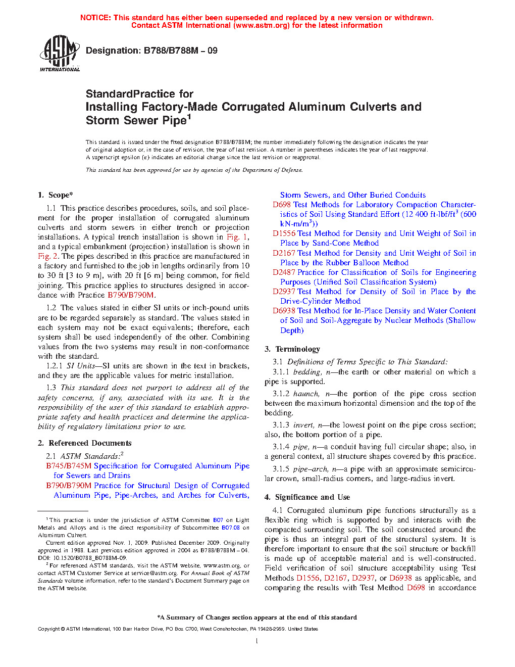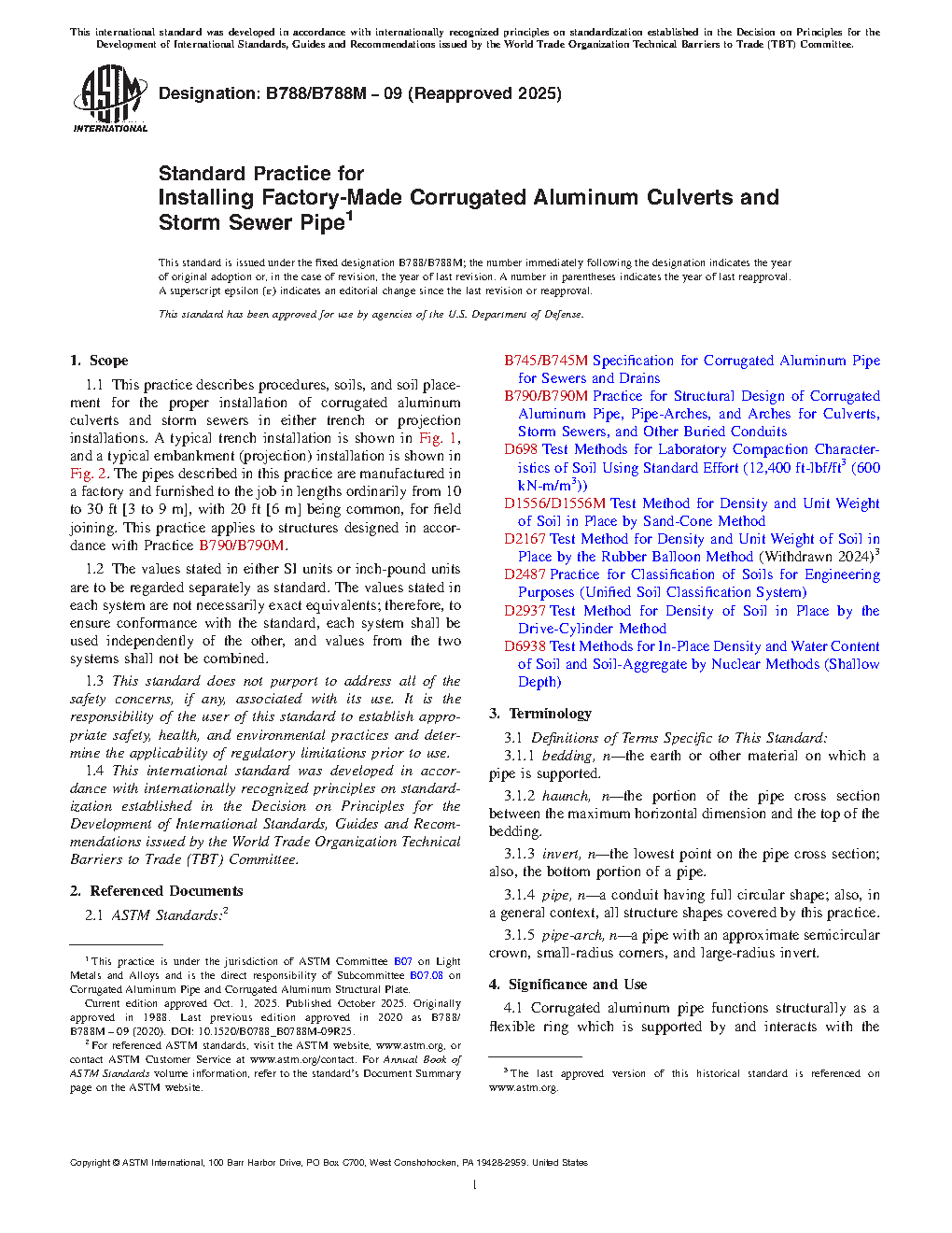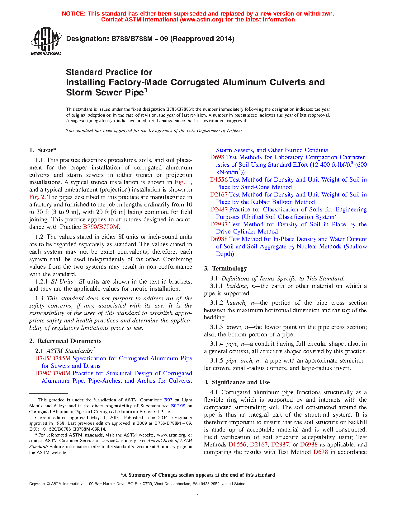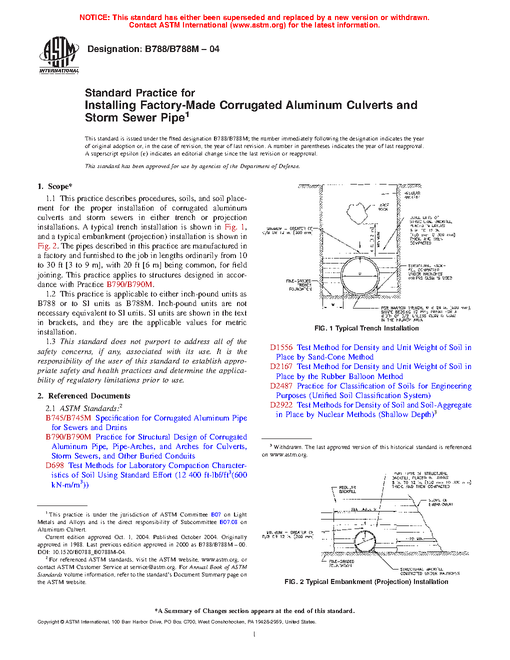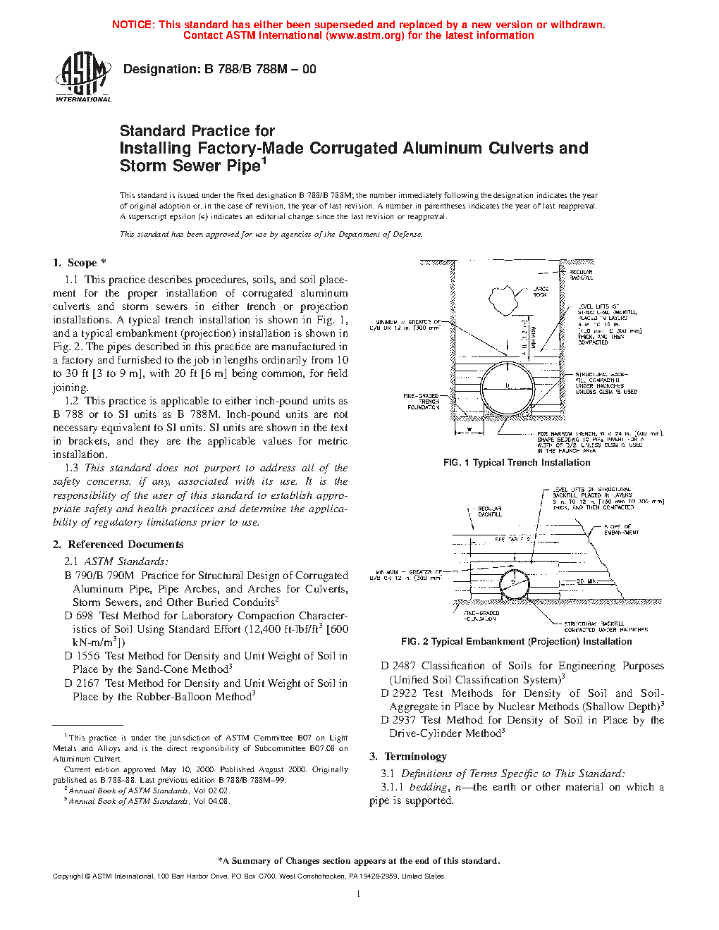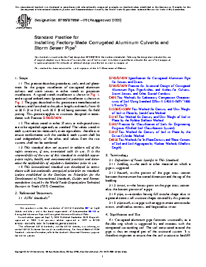 1.1 This practice describes procedures, soils, and soil placement for the proper installation of corrugated aluminum culverts and storm sewers in either trench or projection installations. A typical trench installation is shown in Fig. 1, and a typical embankment (projection) installation is shown in Fig. 2. The pipes described in this practice are manufactured in a factory and furnished to the job in lengths ordinarily from 10 to 30 ft [3 to 9 m], with 20 ft [6 m] being common, for field joining. This practice applies to structures designed in accordance with Practice B790/B790M.