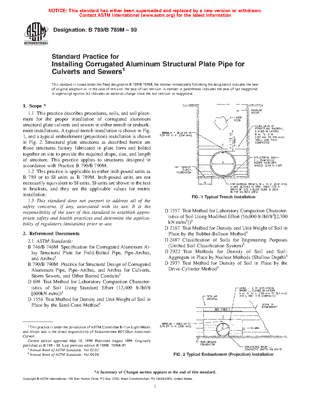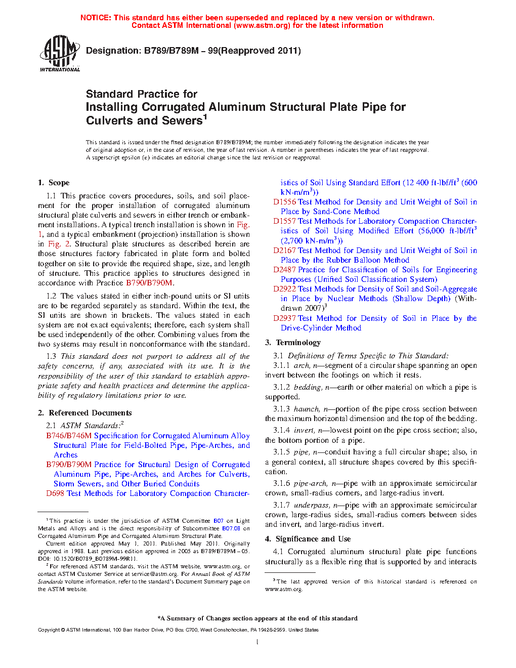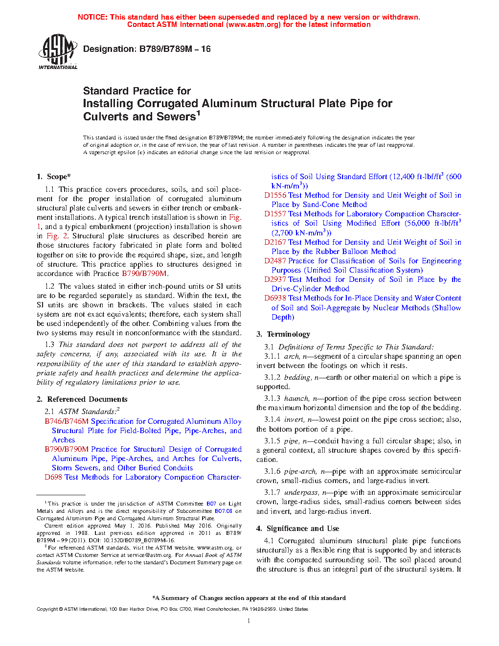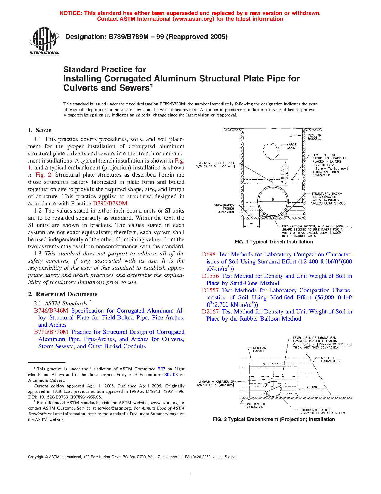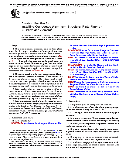 1.1 This practice describes procedures, soils, and soil placement for the proper installation of corrugated aluminum structural plate culverts and sewers in either trench or embankment conditions. Structural plate structures as described herein are those structures factory fabricated in plate form and bolted together on site to provide the required shape, size, and length of structure. This practice applies to structures designed in accordance with Practice B 790/B 790M.
