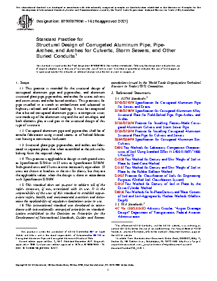 1.1 This practice is intended for the structural design of corrugated aluminum pipe and pipe-arches, and aluminum structural plate pipe, pipe-arches, and arches for use as culverts and storm sewers and other buried conduits. This practice is for pipe installed in a trench or embankment and subjected to highway, railroad, and aircraft loadings. It must be recognized that a buried corrugated aluminum pipe is a composite structure made up of the aluminum ring and the soil envelope, and both elements play a vital part in the structural design of this type of structure.