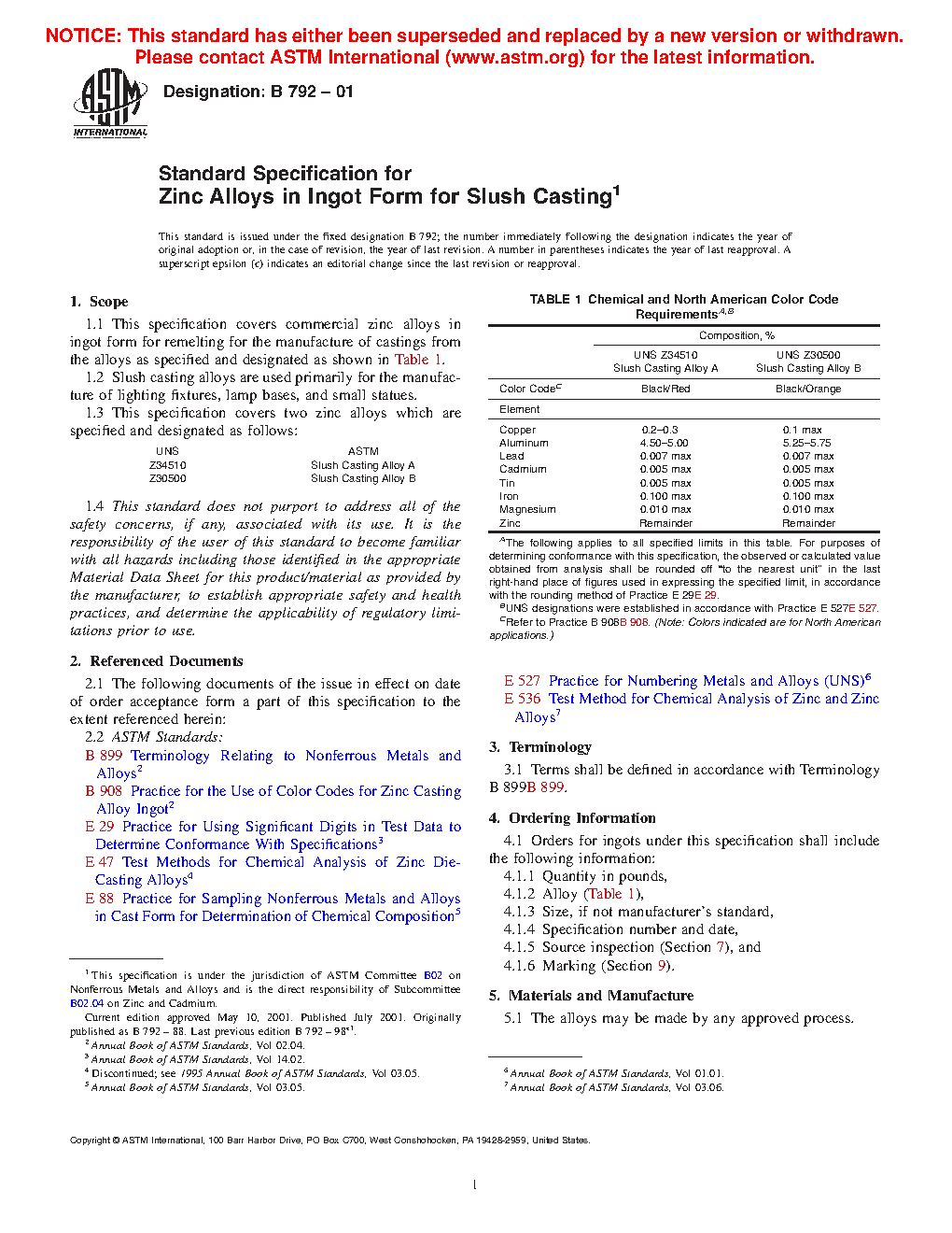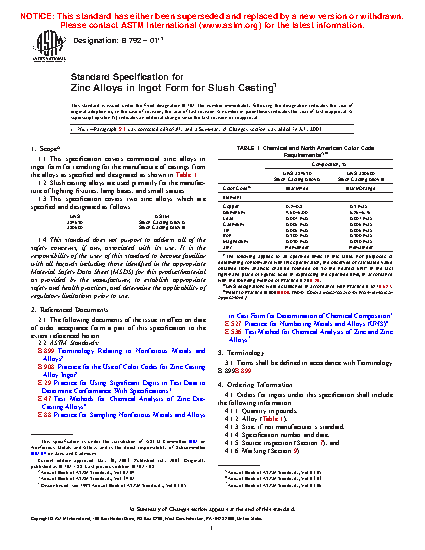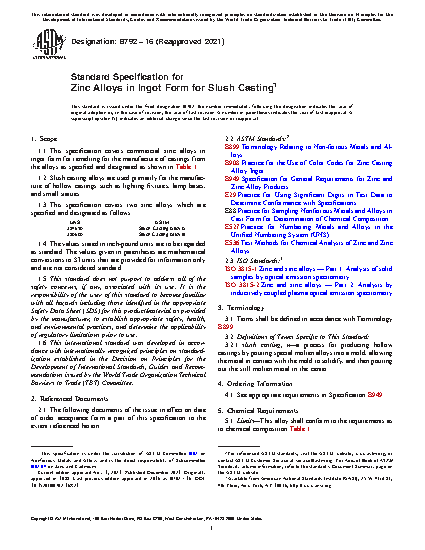 1.1 This specification covers commercial zinc alloys in ingot form for remelting for the manufacture of castings from the alloys as specified and designated as shown in Table 1.