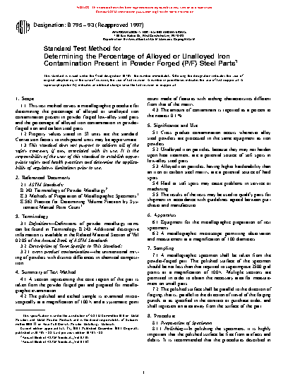 1.1 This test method covers a metallographic procedure for determining the percentage of alloyed or unalloyed iron contamination present in powder forged low-alloy steel materials and the percentage of alloyed iron contamination in powder forged iron and carbon steel materials.