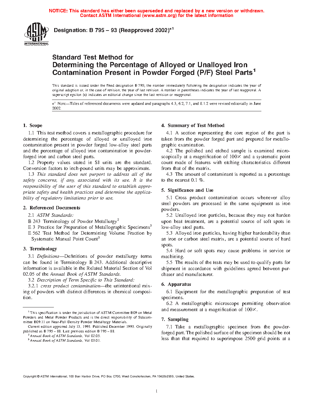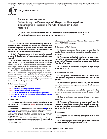 1.1 This test method covers a metallographic procedure for determining the percentage of alloyed or unalloyed iron contamination present in powder forged low-alloy steel materials and the percentage of alloyed iron contamination in powder forged iron and carbon steel materials.