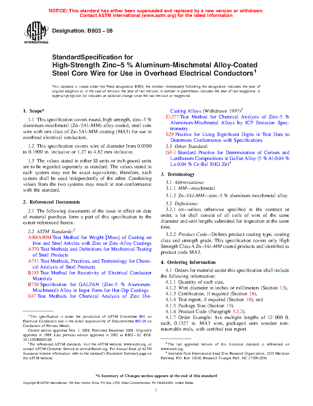 1.1 This specification covers round, high strength, zinc–5 % aluminum-mischmetal (Zn–5Al–MM) alloy-coated, steel core wire with one class of Zn–5Al–MM coating (MA3) for use in overhead electrical conductors.