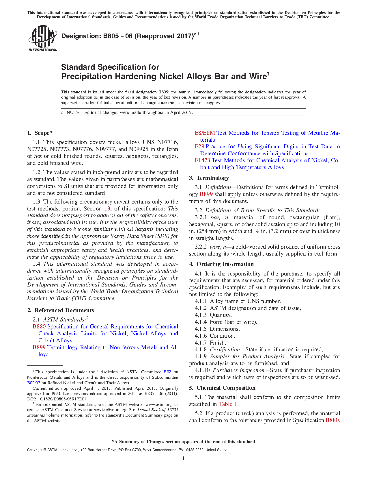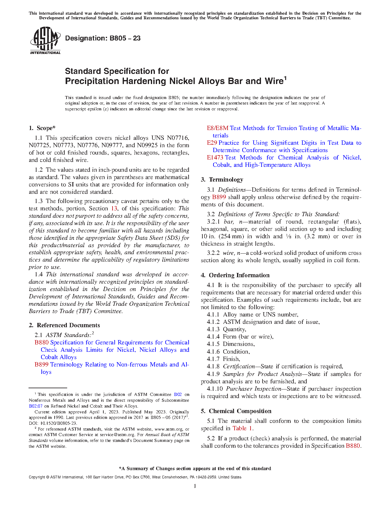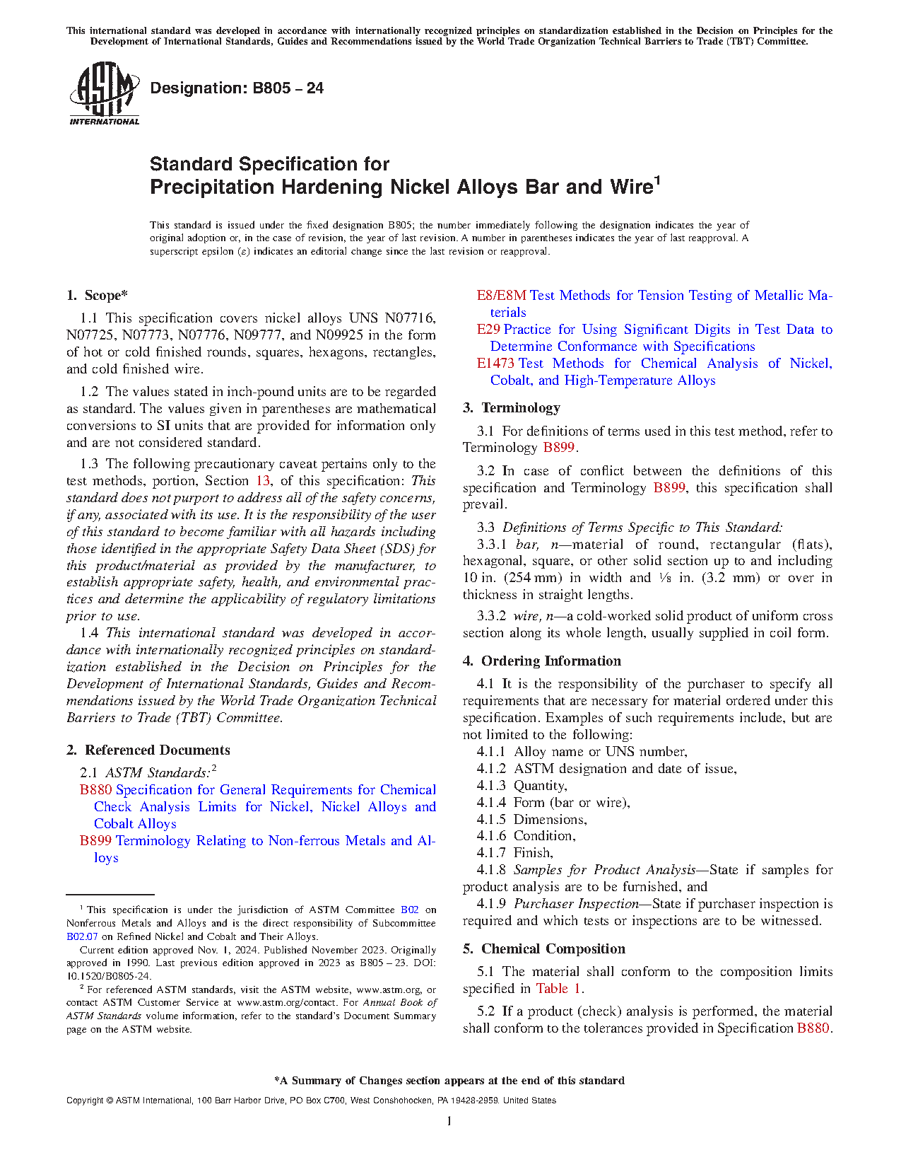1.1 This specification covers nickel alloys UNS N07716, N07725, N07773, N07776, N09777, and N09925 in the form of hot or cold finished rounds, squares, hexagons, rectangles, and cold finished wire.
