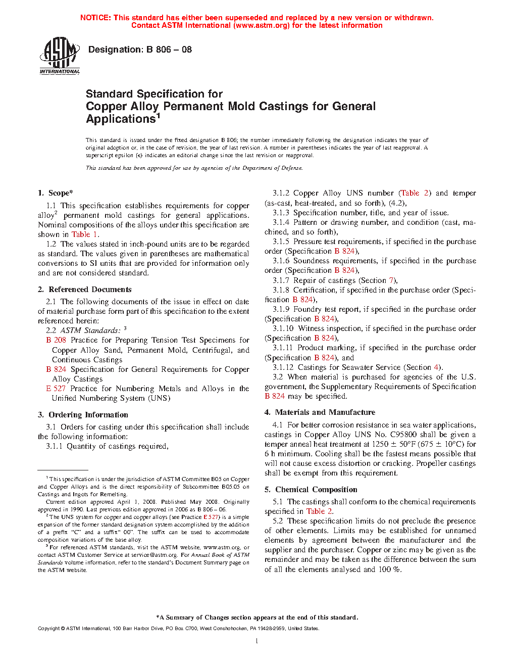 Standard Specification for Copper Alloy Permanent Mold Castings for General Applications