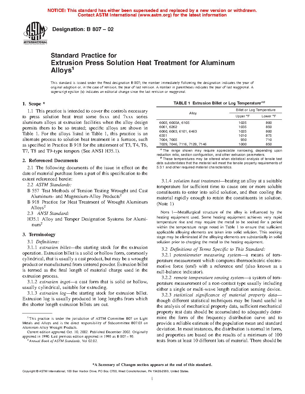 1.1 This practice is intended to cover the controls necessary to press solution heat treat some 6XXX and 7XXX series aluminum alloys at extrusion facilities when the alloy design permits them to be so treated; specific alloys are shown in Table 1. For the alloys listed in Table 1, this practice is an alternate process to solution heat treatment in a furnace, such as specified in Practice B597 for the attainment of T3, T4, T6, T7, T8 and T9-type tempers.