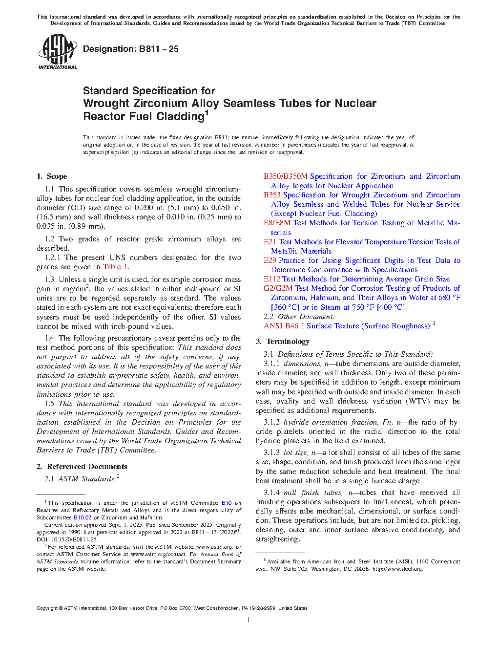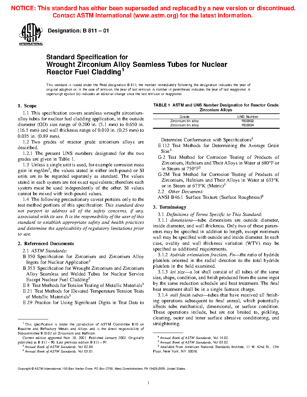 1.1 This specification covers seamless wrought zirconium-alloy tubes for nuclear fuel cladding application, in the outside diameter (OD) size range of 0.200 in. (5.1 mm) to 0.650 in. (16.5 mm) and wall thickness range of 0.010 in. (0.25 mm) to 0.035 in. (0.89 mm).