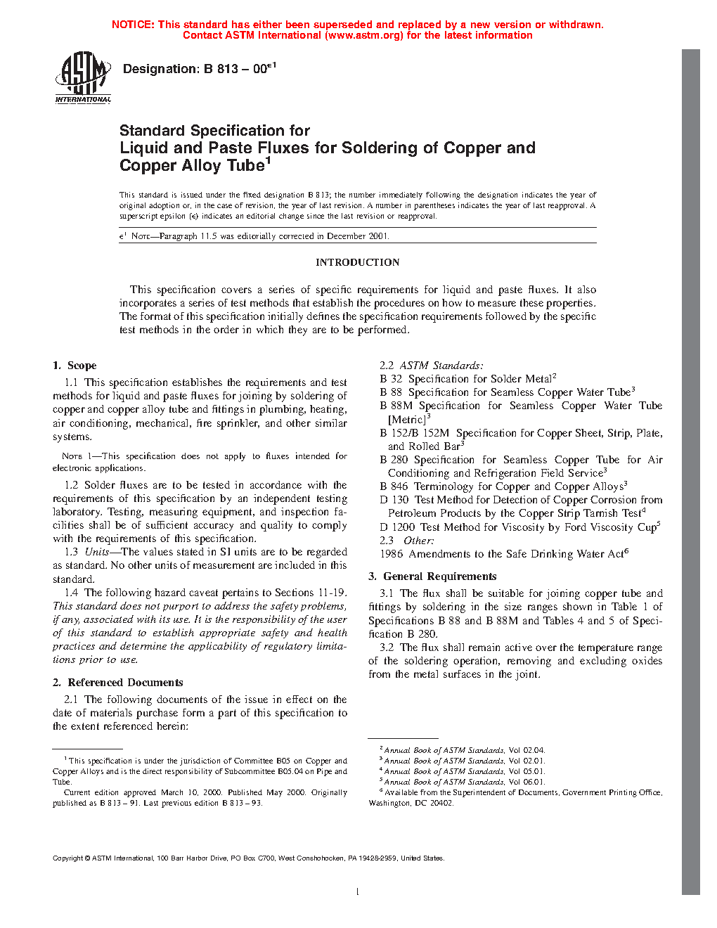 1.1 This specification establishes the requirements and test methods for liquid and paste fluxes for joining by soldering of copper and copper alloy tube and fittings in plumbing, heating, air conditioning, mechanical, fire sprinkler, and other similar systems.