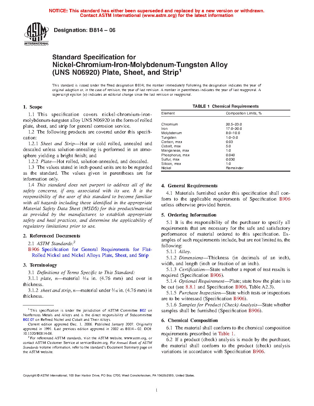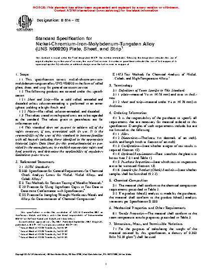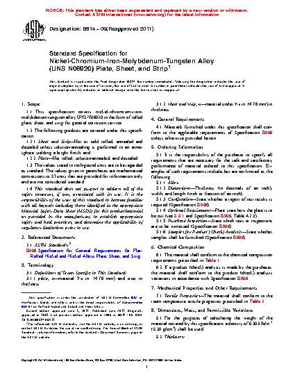 1.1 This specification covers nickel-chromium-iron-molybdenum-tungsten alloy UNS N06920 in the form of rolled plate, sheet, and strip for general corrosion service.
