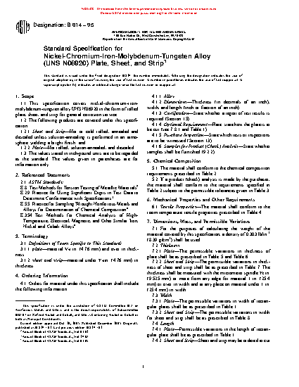 This specification covers the requirements for UNS N06920 nickel-chromium-iron-molybdenum-tungsten alloy in the form of rolled plates, sheets and strips for general corrosion service. The range of products covered here includes brightly finished hot or cold rolled, annealed and descaled unless solution-annealed sheets and strips and hot rolled, solution-annealed, and descaled plates.