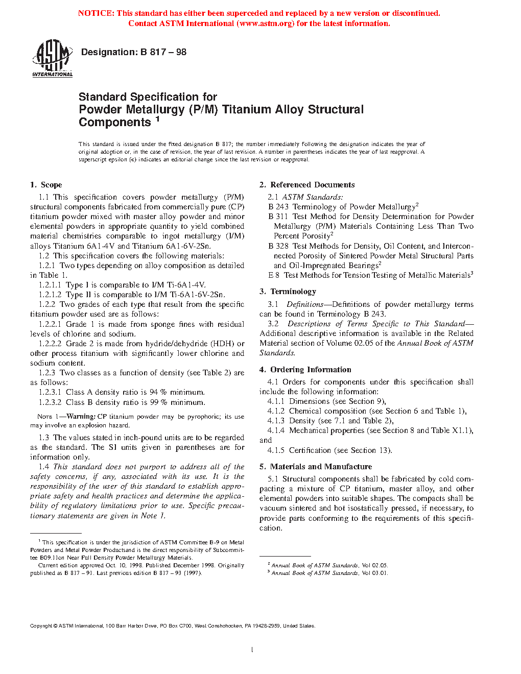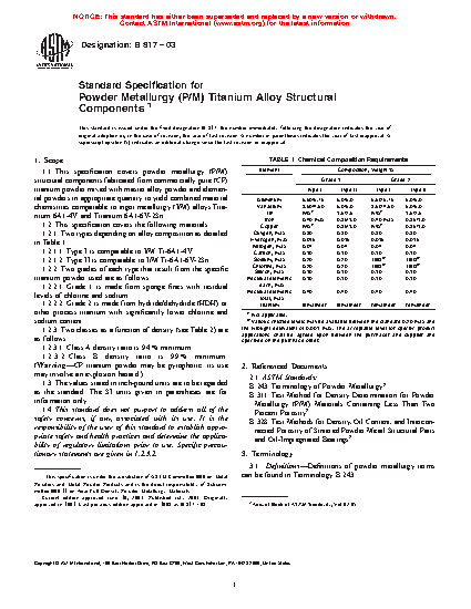 1.1 This specification covers powder metallurgy (P/M) structural components fabricated from commercially pure (CP) titanium powder blended with master alloy powder and minor elemental powders in appropriate quantity to yield combined material chemistries comparable to ingot metallurgy (I/M) alloys Titanium 6A1-4V and Titanium 6A16V-2Sn.