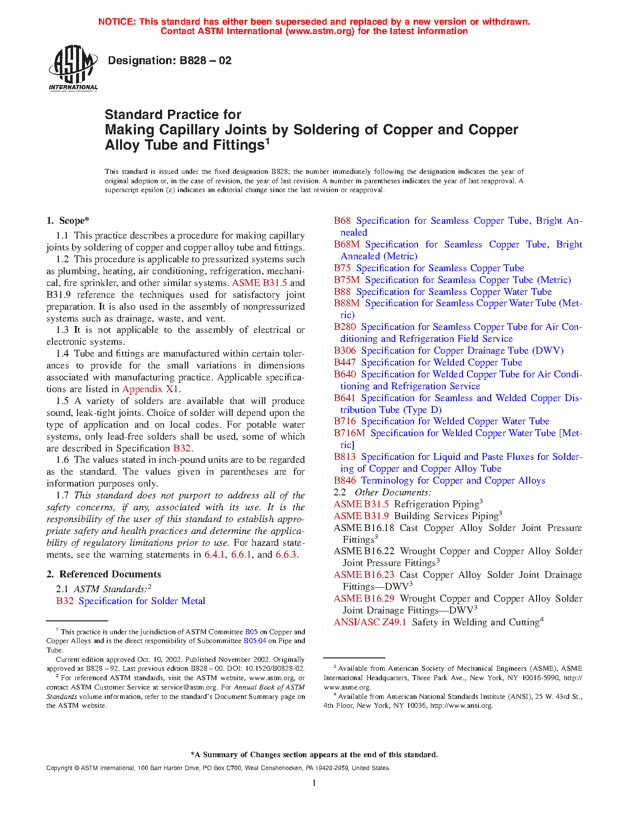 1.2 This procedure is applicable to pressurized systems such as plumbing, heating, air conditioning, refrigeration, mechanical, fire sprinkler, and other similar systems. ASME B31.5 and B31.9 reference the techniques used for satisfactory joint preparation. It is also used in the assembly of nonpressurized systems such as drainage, waste, and vent.