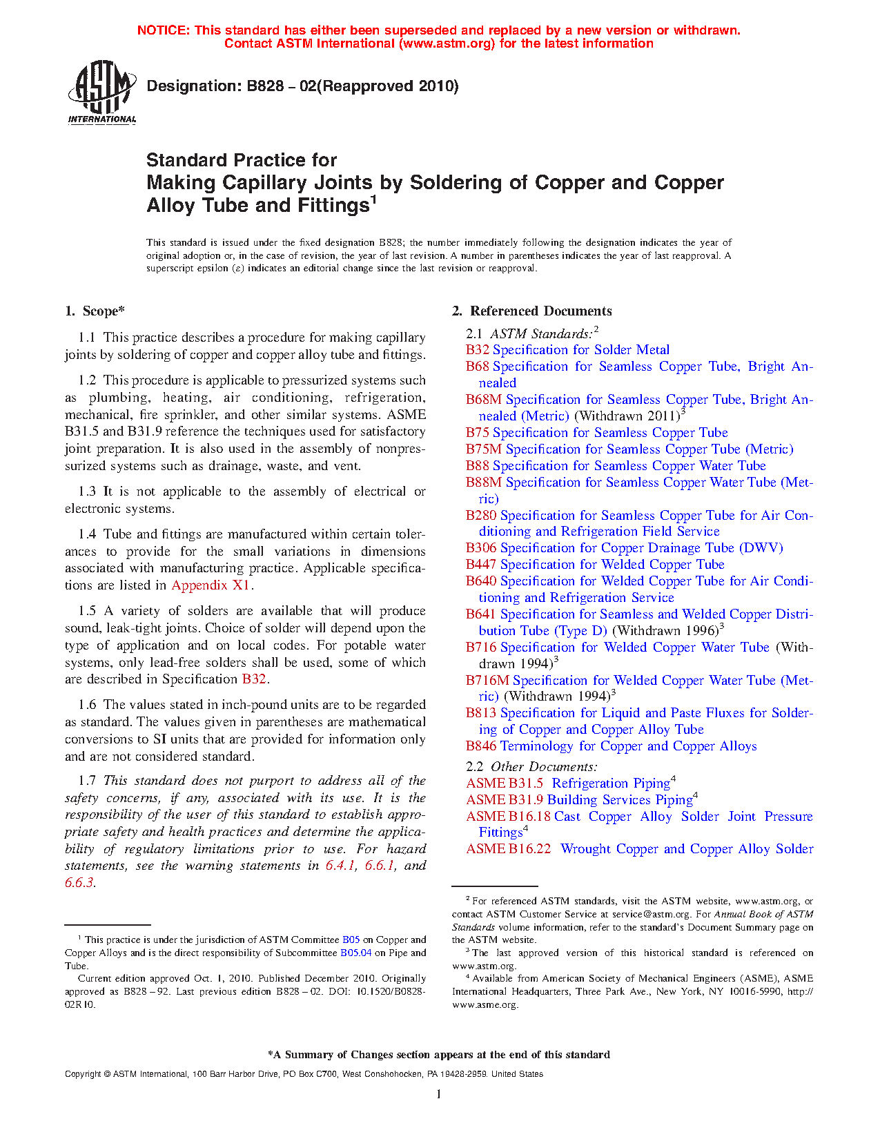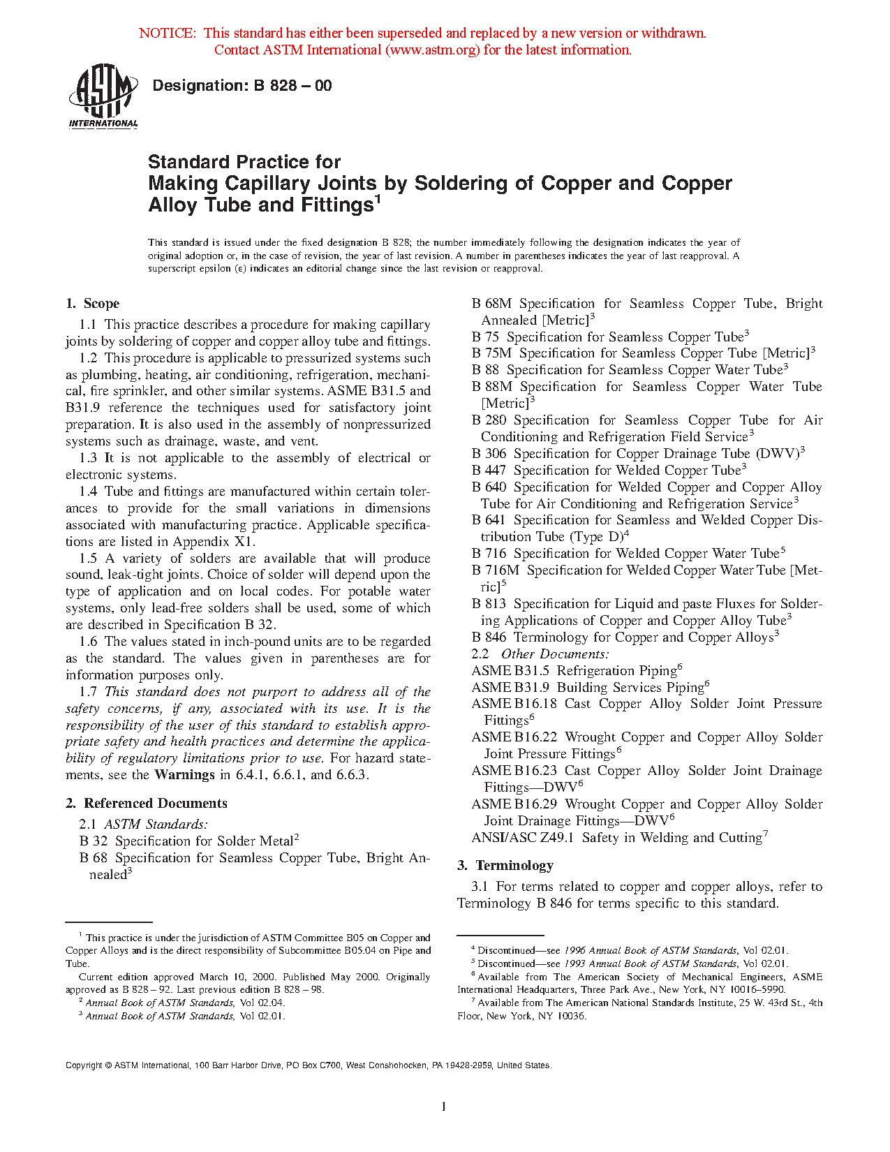 1.5 A variety of solders are available that will produce sound, leak-tight joints. Choice of solder will depend upon the type of application and on local codes. For potable water systems, only lead-free solders shall be used, some of which are described in Specification B 32.