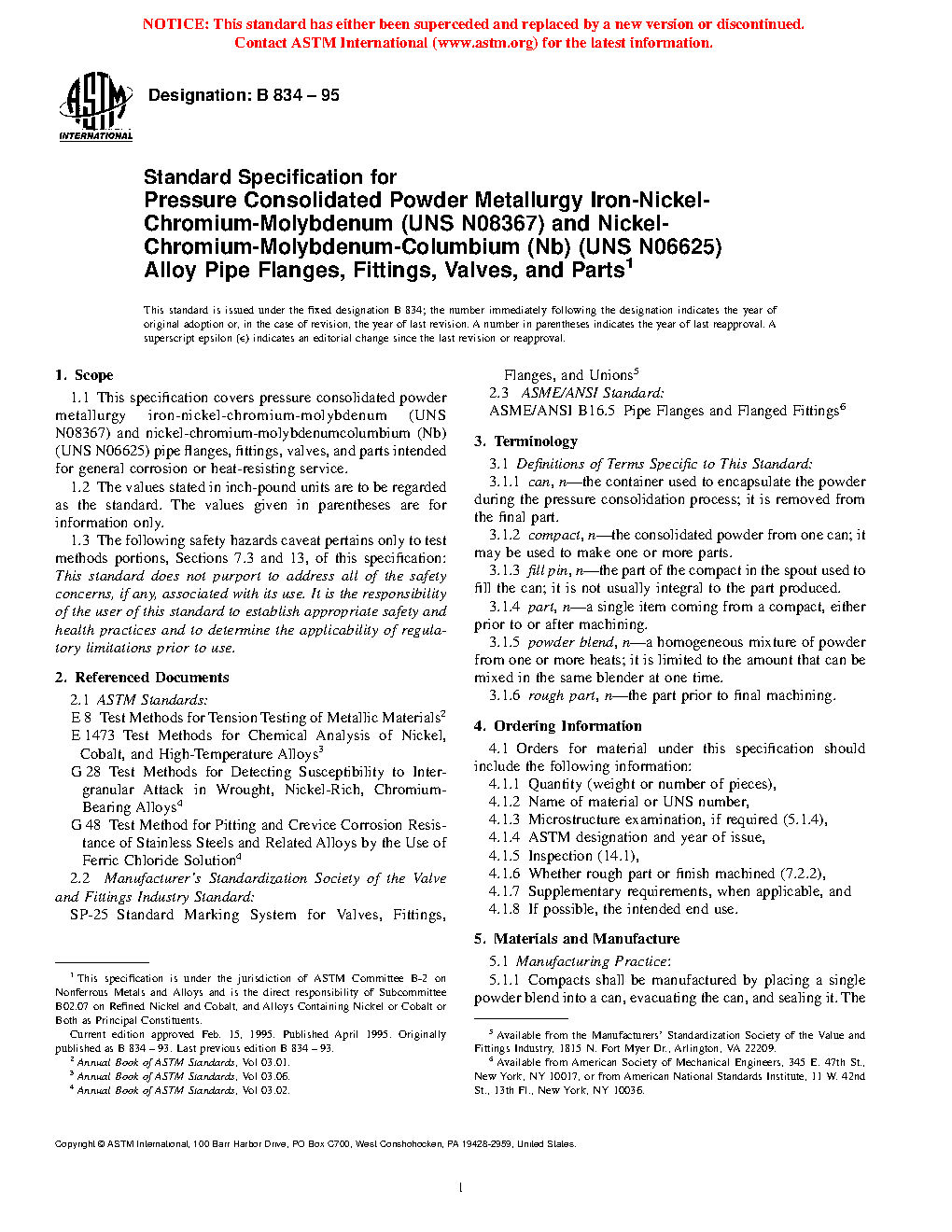 This specification tackles standards for pressure consolidated powder metallurgy iron-nickel-chromium-molybdenum and nickel-chromium-molybdenum-columbium pipe flanges, fittings, valves, and parts intended for general corrosion or heat-resisting service. Compacts shall be manufactured by placing a single powder blend into a can, evacuating the can, and sealing it. The can material shall then be selected to ensure that it has no deleterious effect on the final product. The specimen shall be heated and placed under sufficient pressure for a sufficient period of time to ensure that the final consolidated part is fully dense. The powder shall be produced by vacuum melting followed by gas atomization. The heats shall be thoroughly mixed to ensure homogeneity when powder from more than one heat is used to make a blend. The material shall have the chemical compositions of carbon, manganese, silicon, phosphorus, sulfur, chromium, molybdenum, nickel, iron, cobalt, columbium, aluminum, titanium, nitrogen, and copper. Hydrostatic test shall be conducted and the specimen must show no leaks. The density test shall be performed using sample suspended from a scale and weighed in air and water using Archimede’s principle. Check Analysis shall be wholly the responsibility of the purchaser. The parts of the specimen shall be uniform in quality and condition, and shall be free from injurious imperfections.