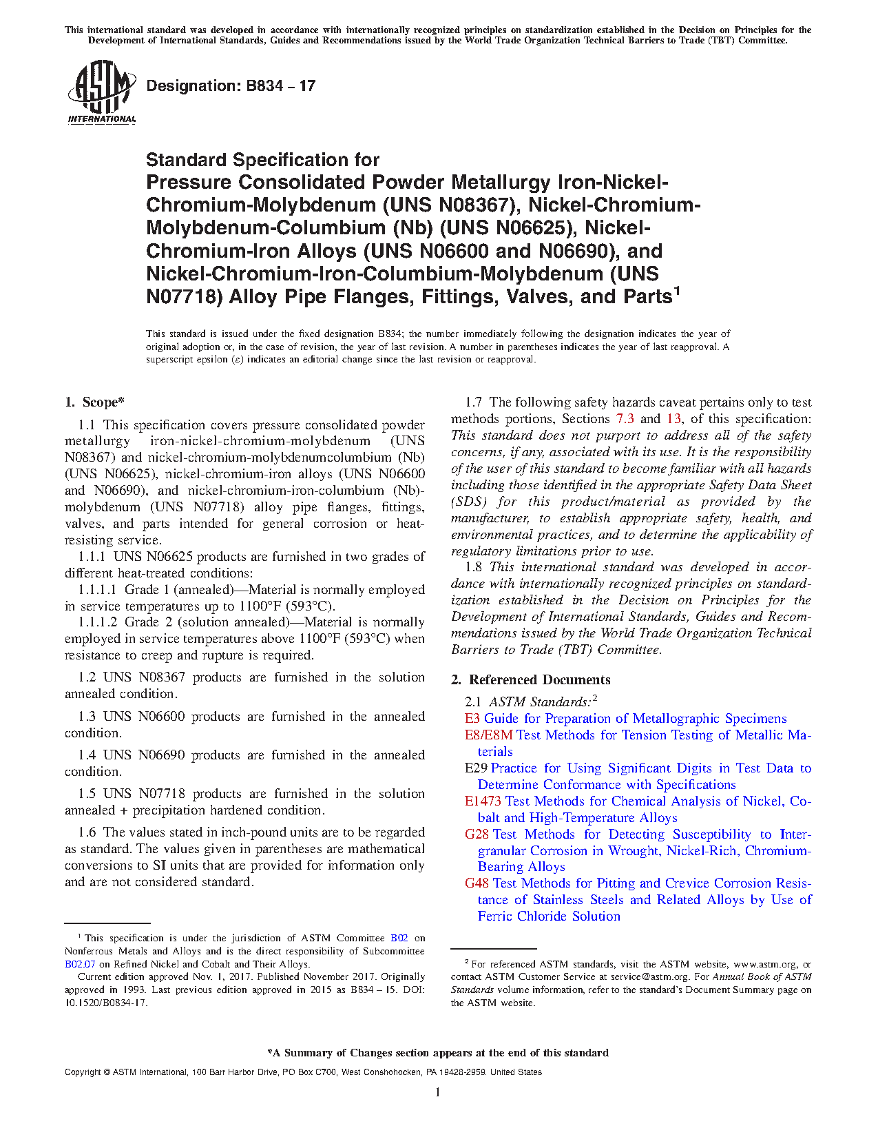 1.1 This specification covers pressure consolidated powder metallurgy iron-nickel-chromium-molybdenum (UNS N08367) and nickel-chromium-molybdenumcolumbium (Nb) (UNS N06625) pipe flanges, fittings, valves, and parts intended for general corrosion or heat-resisting service.