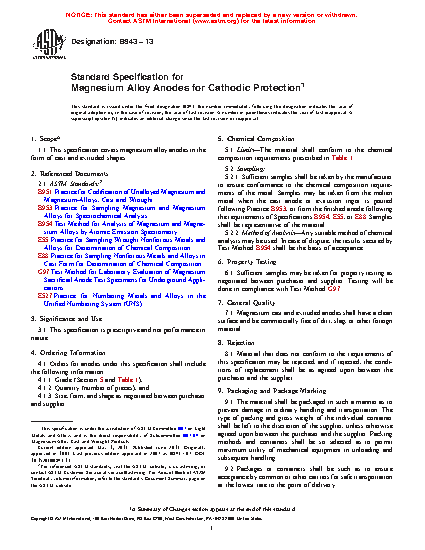 This specification covers the standard requirements for magnesium alloy anodes in the form of cast and extruded shapes for use in cathodic protection. Materials shall adhere to specified chemical composition requirements, the samples for analysis of which shall be taken either from the molten metal when the cast anode or extrusion ingot is poured, or from the finished anode. Anodes shall have a clean surface and be commercially free of dirt, slag, or other foreign material.