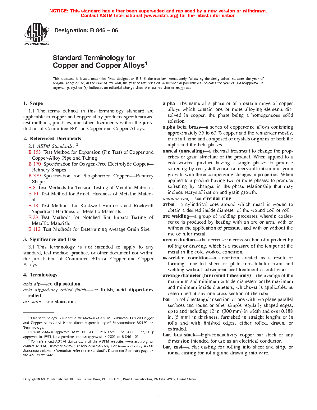 1.1 The terms defined in this terminology standard are applicable to copper and copper alloy products specifications, test methods, practices, and other documents within the jurisdiction of Committee B05 on Copper and Copper Alloys.