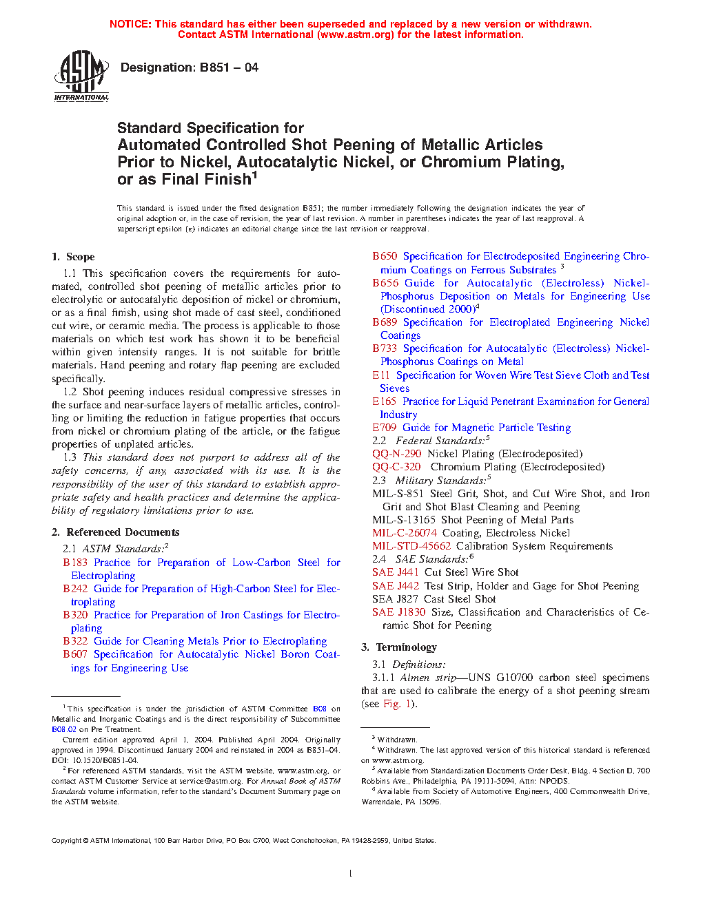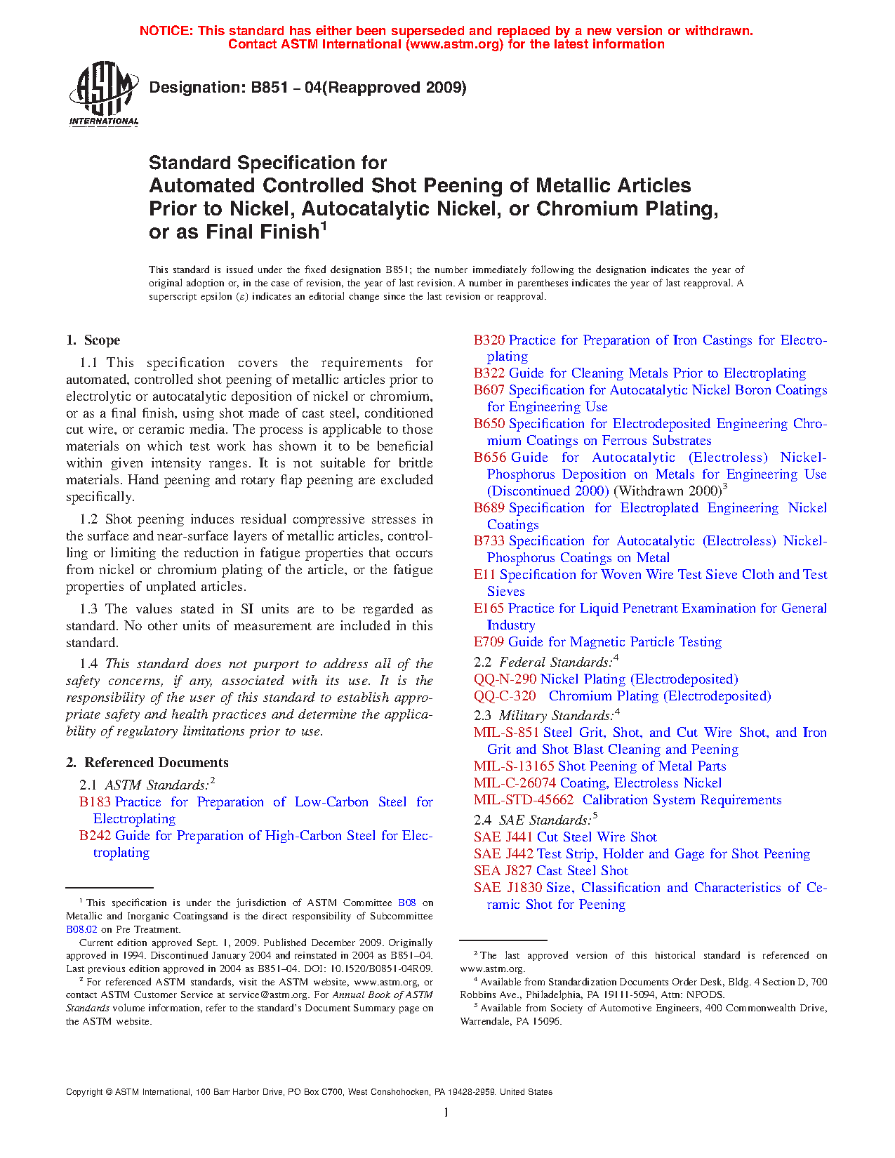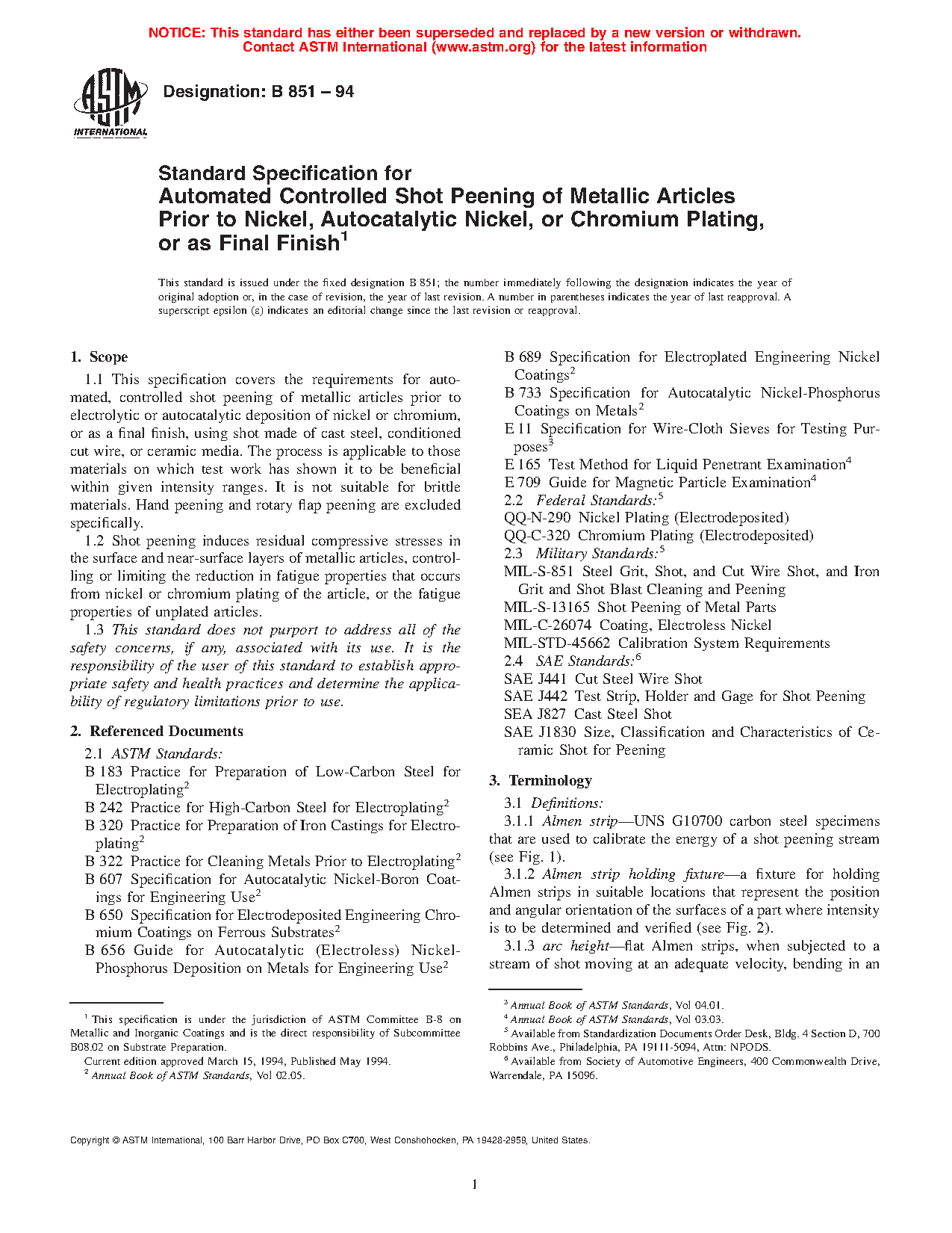 This specification covers the requirements for automated, controlled shot peening of metallic articles prior to electrolytic or autocatalytic deposition of nickel or chromium, or as a final finish, using shot made of cast steel, conditioned cut wire, or ceramic media. The process is applicable to those materials on which test work has shown it to be beneficial within given intensity ranges. It is not suitable for brittle materials. Hand peening and rotary flap peening are excluded specifically. Shot peening induces residual compressive stresses in the surface and near-surface layers of metallic articles, controlling or limiting the reduction in fatigue properties that occurs from nickel or chromium plating of the article, or the fatigue properties of unplated articles. It is a process for cold working surfaces by bombarding the product with shot of a solid and spherical nature propelled at a relatively high velocity. Cast steel, cut wire, and ceramic shot shall all be spherical in shape and shall all be free of sharp edges, corners, and broken pieces. Prior to shot peening, the following operations shall be done first: heat treatment, machining, grinding, flaw test, crack test, corrosion detection, cleaning, and masking. Peened surfaces shall be uniform in appearance and completely dented so that the original surface is obliterated entirely. After shot peening, the following methods shall be done: residual shot removal, surface finishing, chemical cleaning of nonferrous metals and their alloys, thermal and heat treatments, and corrosion protection.
