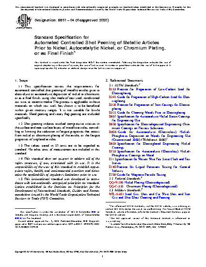 1.1 This specification covers the requirements for automated, controlled shot peening of metallic articles prior to electrolytic or autocatalytic deposition of nickel or chromium, or as a final finish, using shot made of cast steel, conditioned cut wire, or ceramic media. The process is applicable to those materials on which test work has shown it to be beneficial within given intensity ranges. It is not suitable for brittle materials. Hand peening and rotary flap peening are excluded specifically.