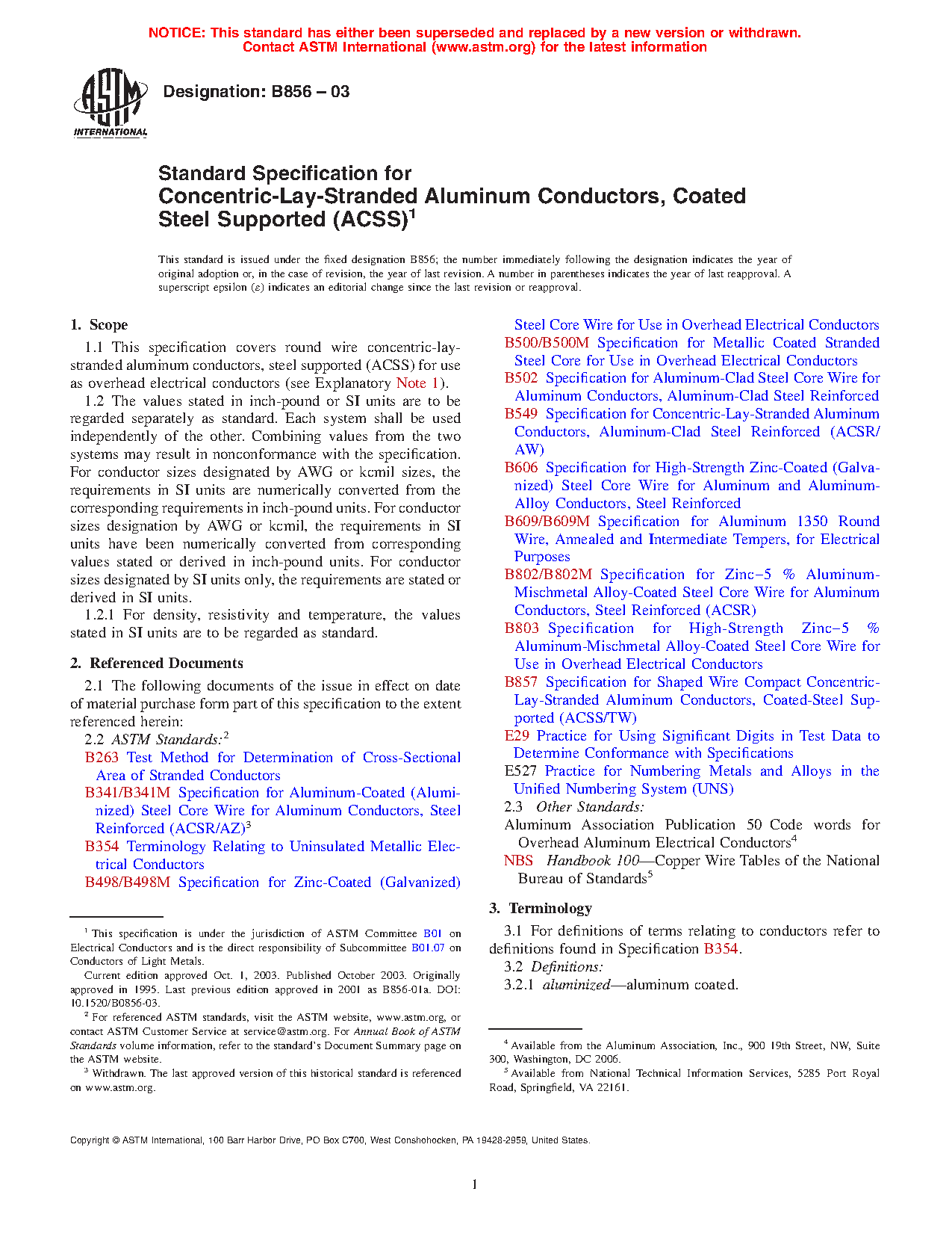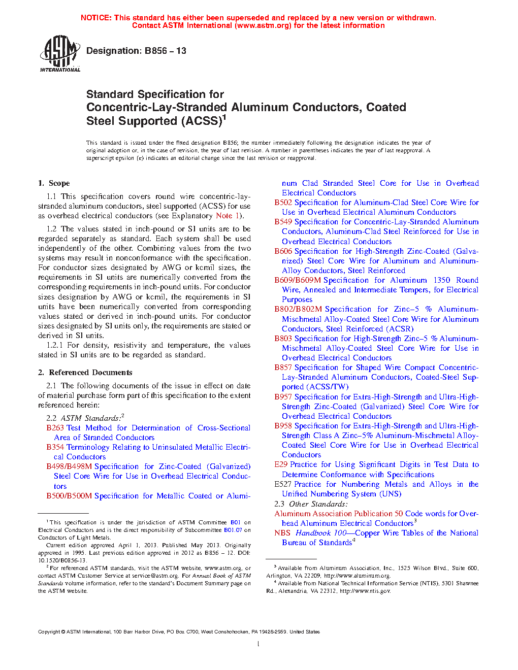 1.1 This specification covers round wire concentric-lay-stranded aluminum conductors, steel supported (ACSS) for use as overhead electrical conductors (see Explanatory Note 1).
