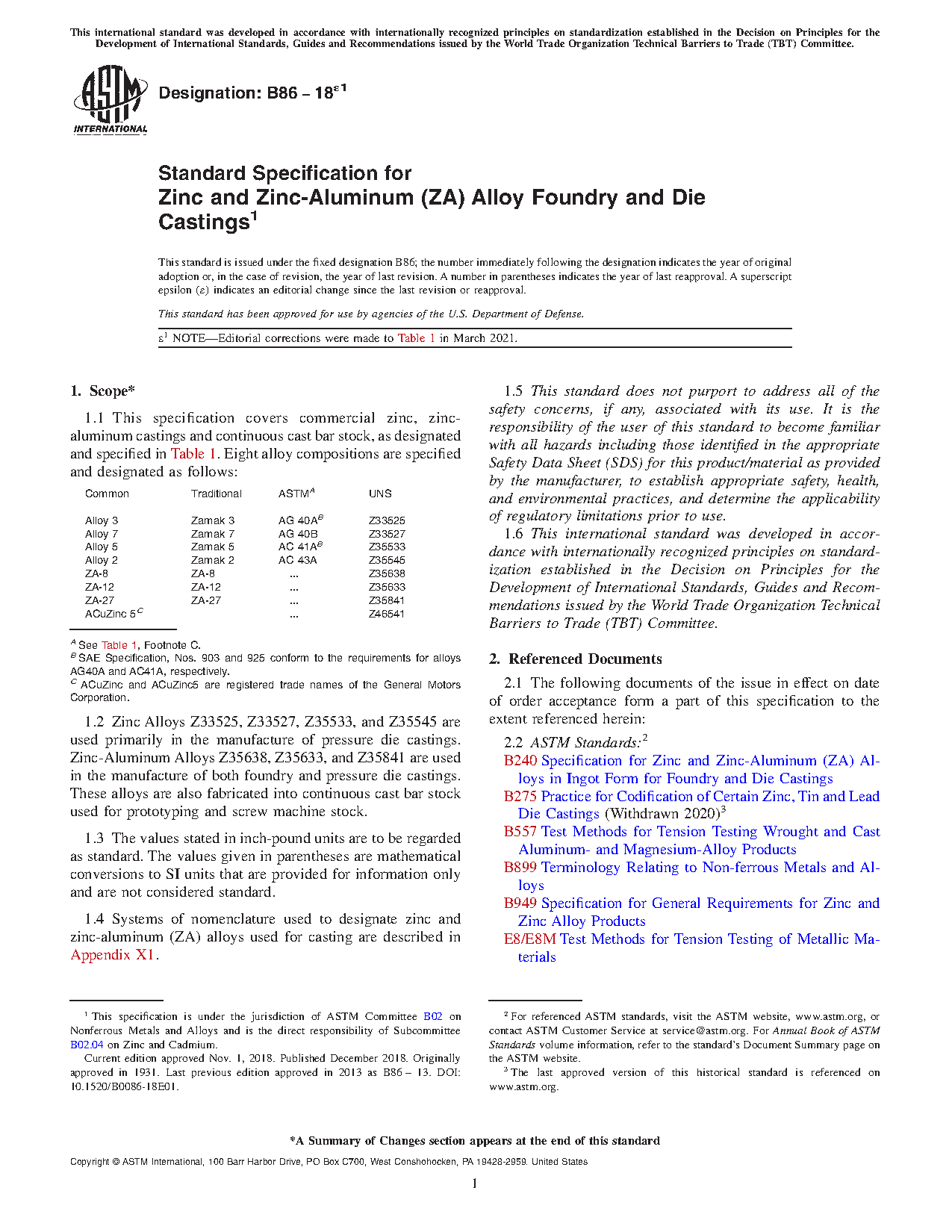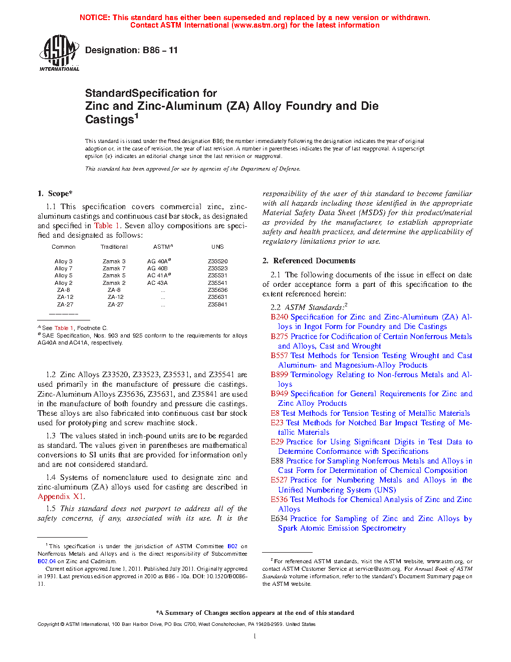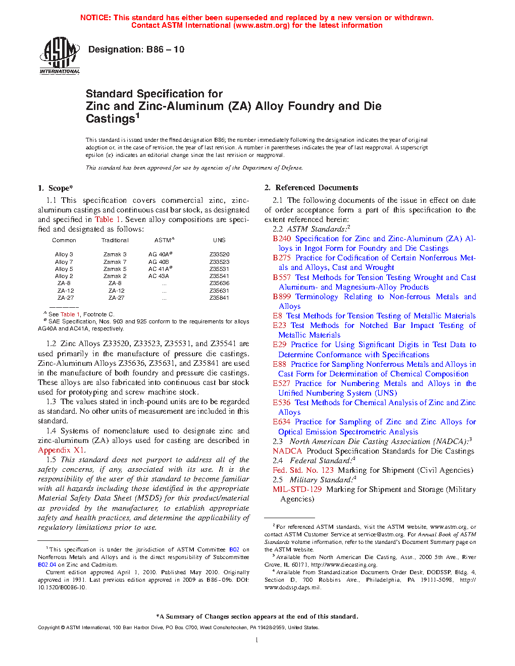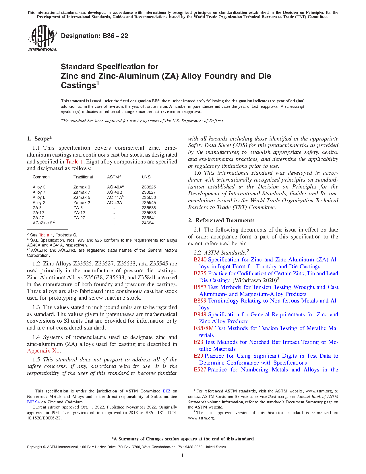 1.1 This specification covers commercial zinc, zinc-aluminum castings and continuous cast bar stock, as designated and specified in Table 1. Seven alloy compositions are specified and designated as follows: