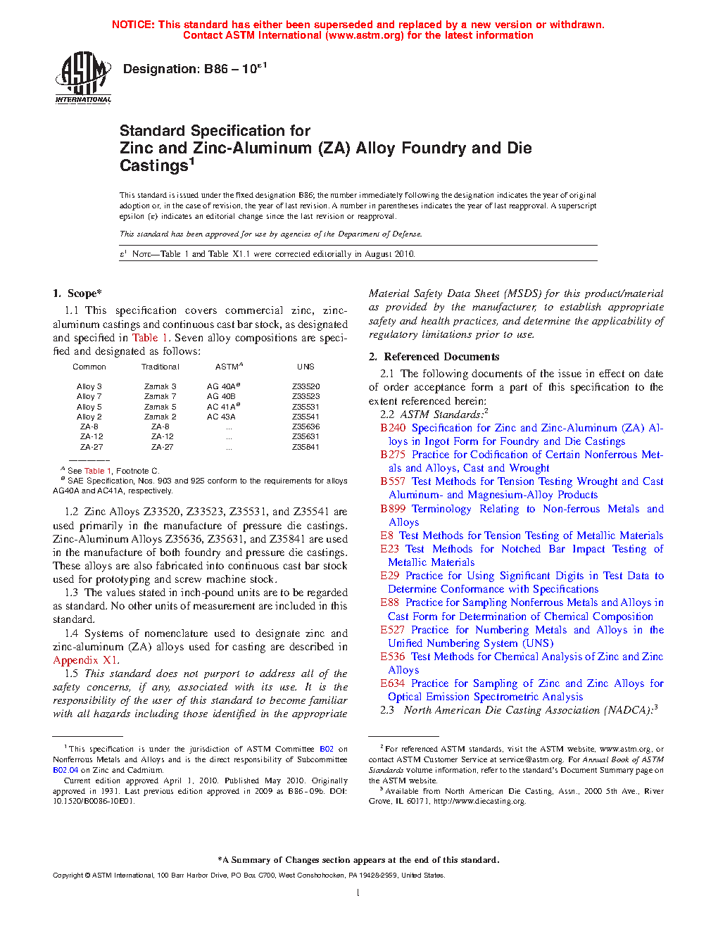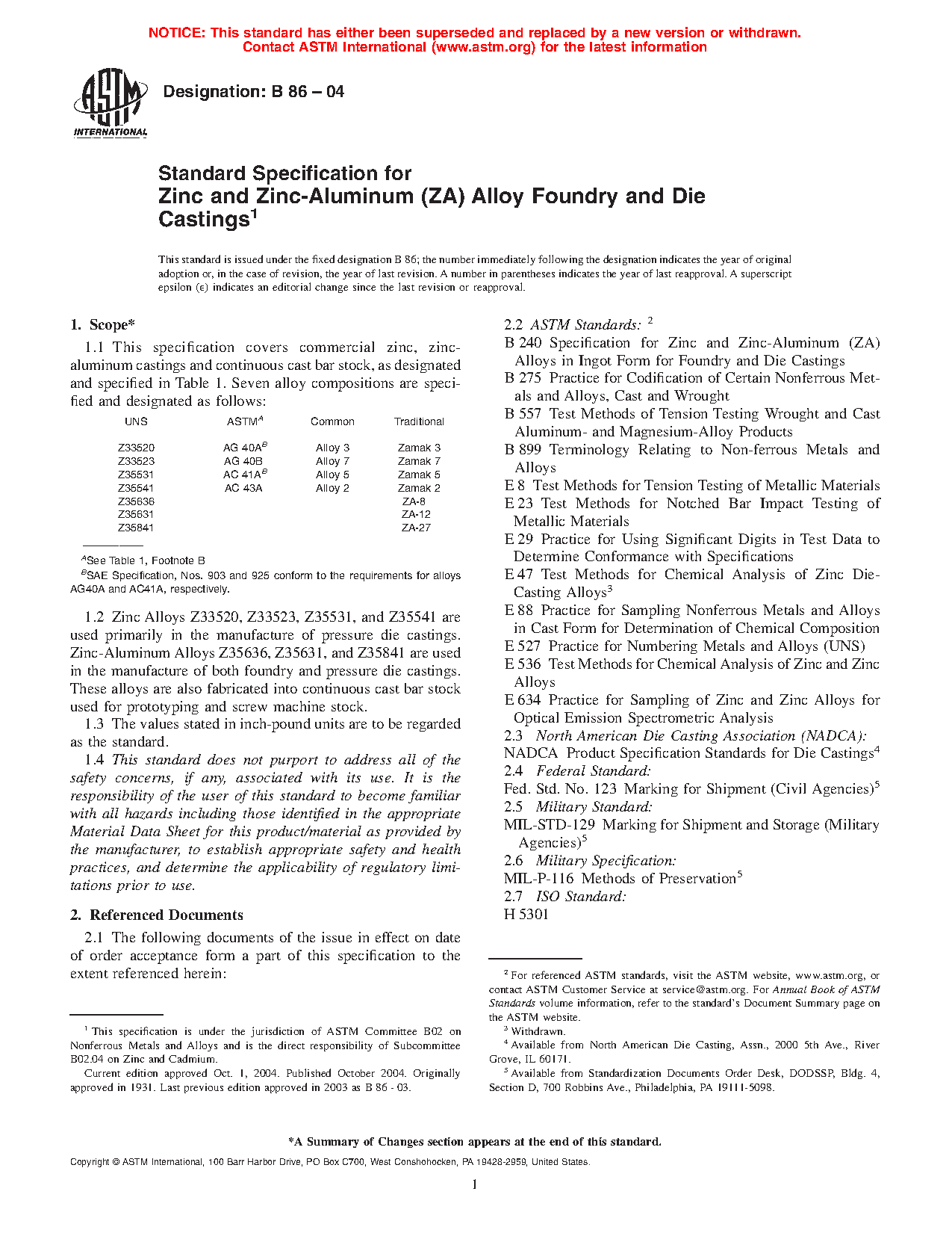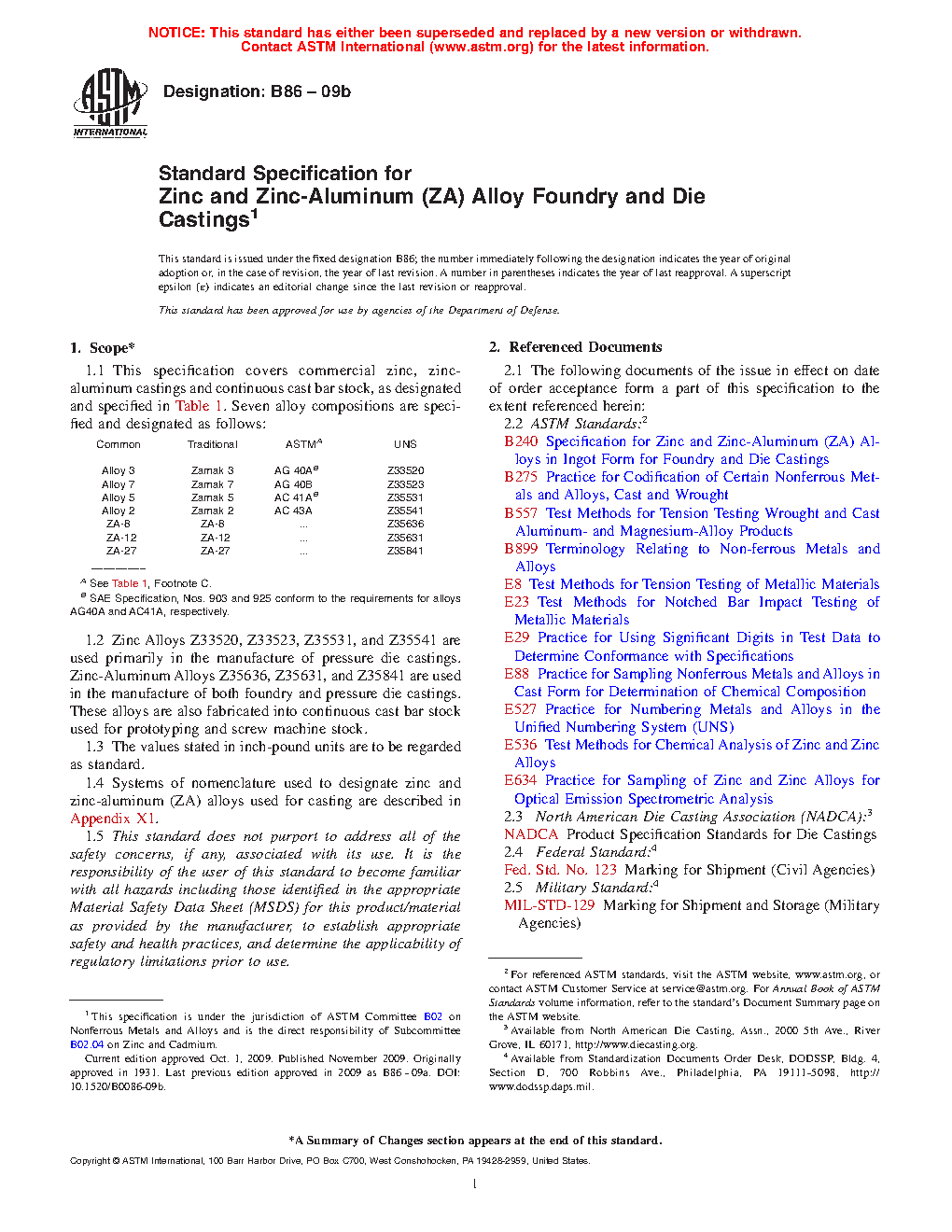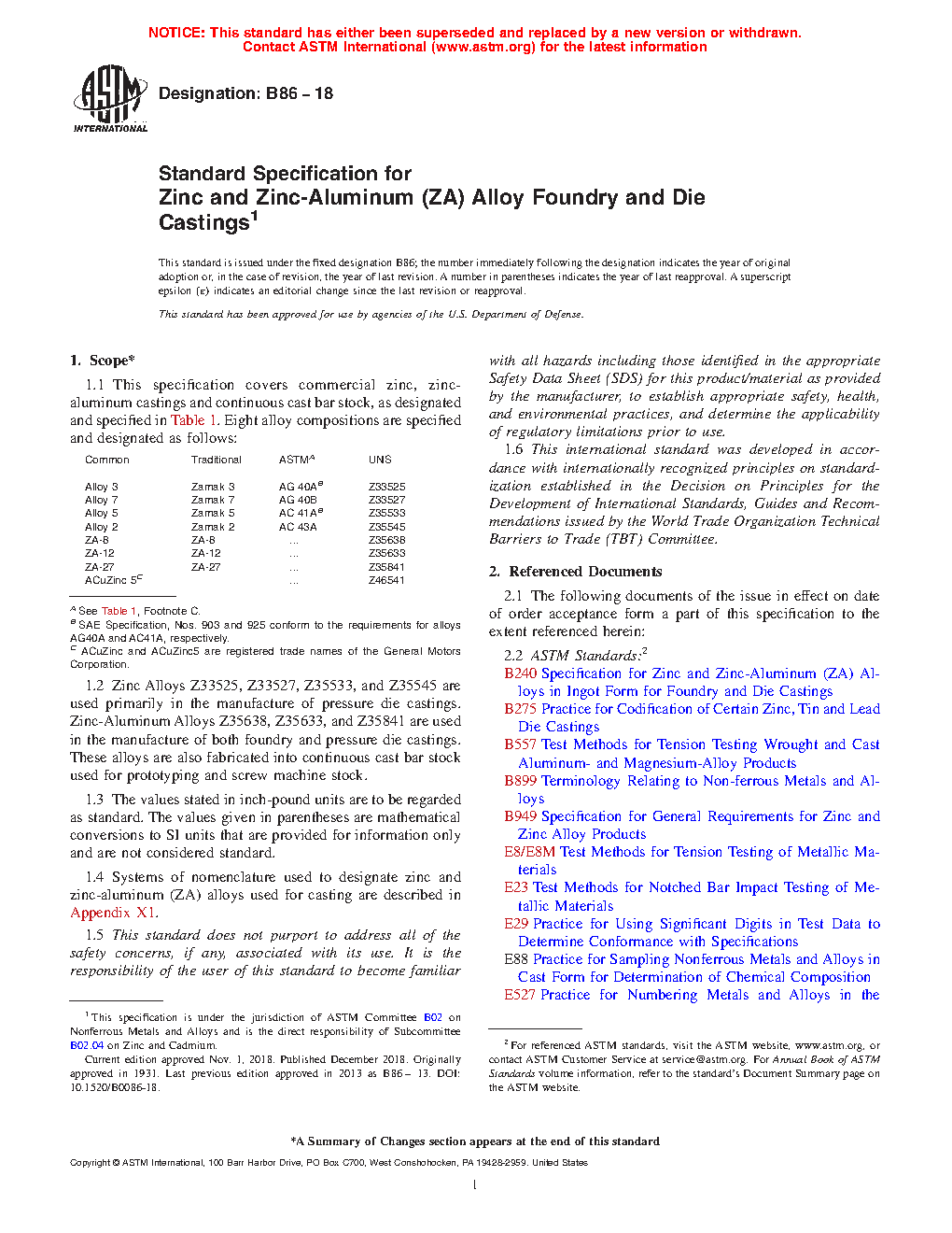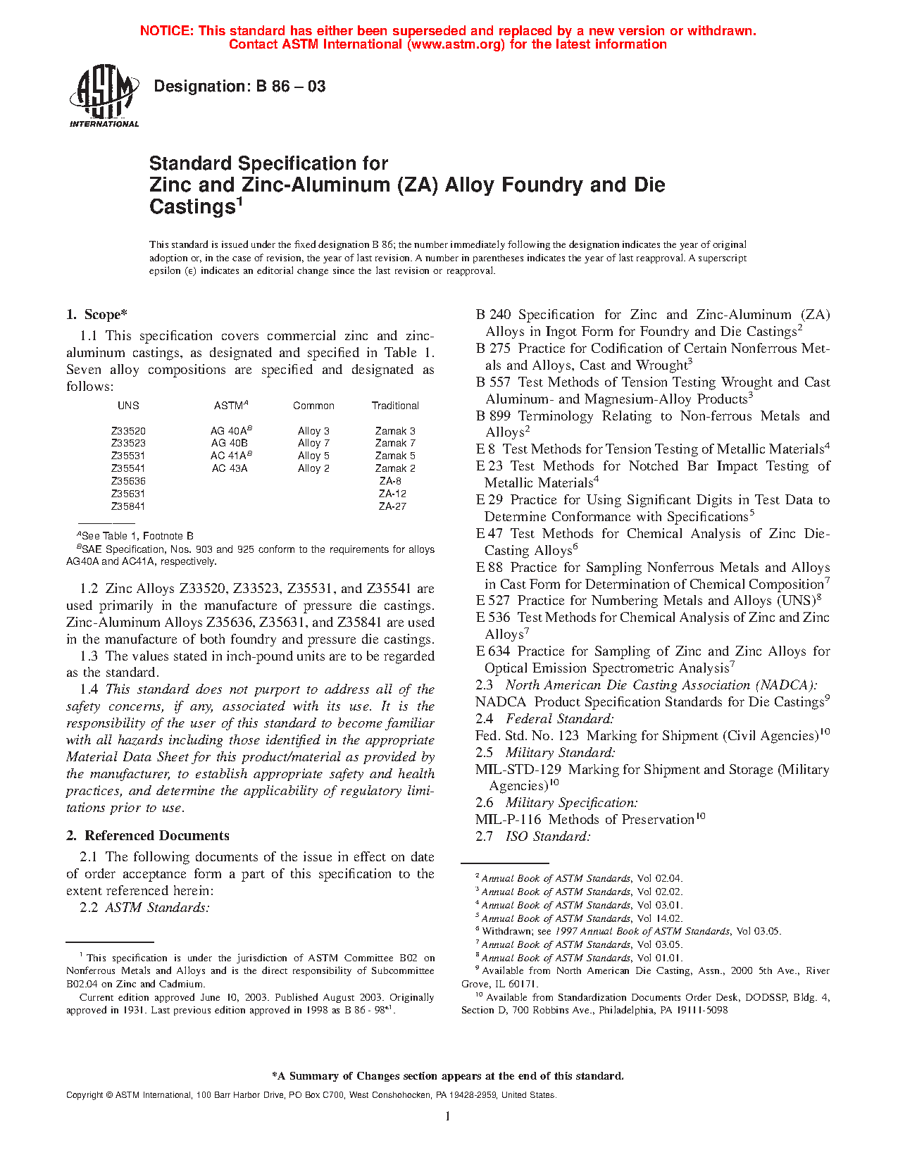 1.1 This specification covers commercial zinc, zinc-aluminum castings and continuous cast bar stock, as designated and specified in Table 1. Seven alloy compositions are specified and designated as follows: